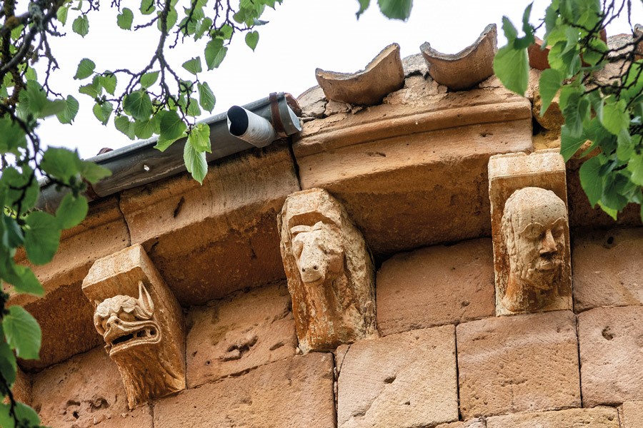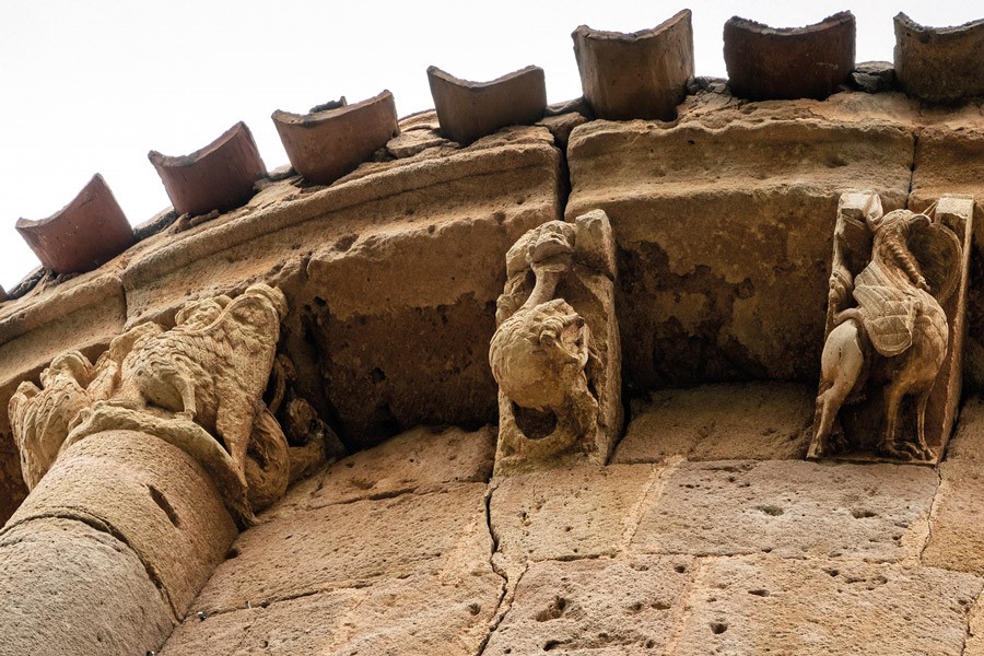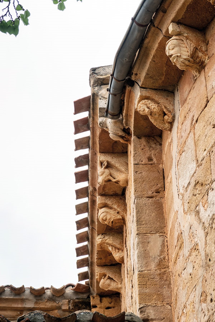 Pero además en el exterior de la cabecera de Hermosilla podemos admirar la obra escultórica dejada por un segundo artista conocido como maestro de Cerezo de Río Tirón. Lo primero que llama la atención es la variedad y calidad desplegada en los numerosos canecillos que coronan los muros del ábside y el presbiterio. Todos son admirables, pero por mencionar algunos destacaremos los bustos masculinos, distintos seres fantásticos y las representaciones de distintos animales, tanto domésticos como salvajes.
