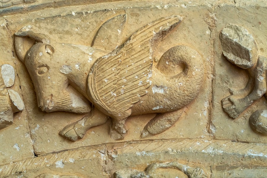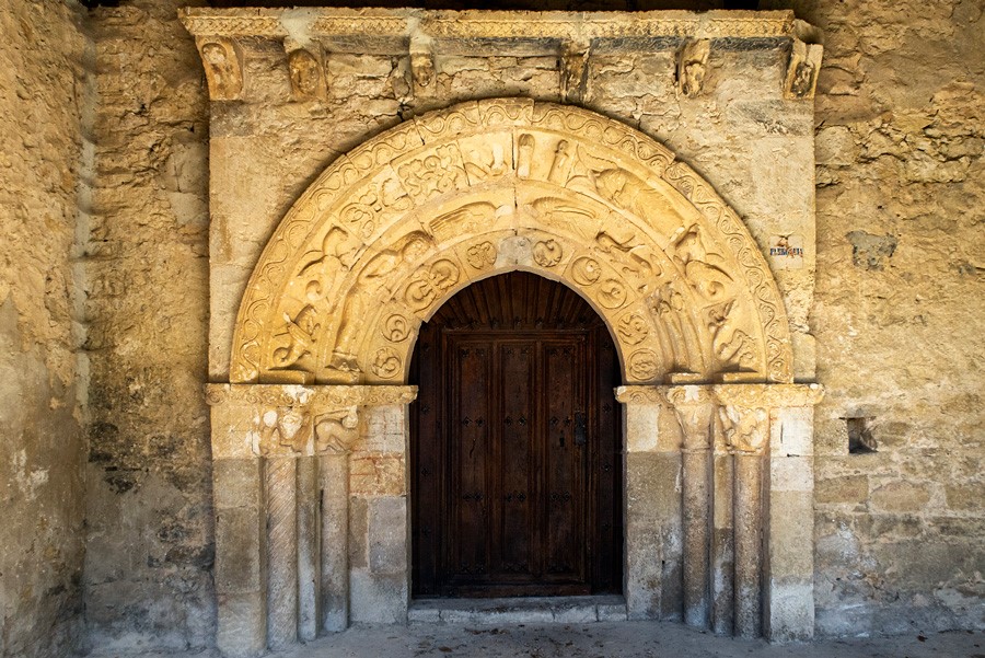 La portada presenta tres arquivoltas profusamente decoradas con interesantes motivos iconográficos. La más interna muestra una serie de medallones en los que para algunos investigadores están representados los signos del Zodiaco, pero que más bien tienen un simbolismo mariano.