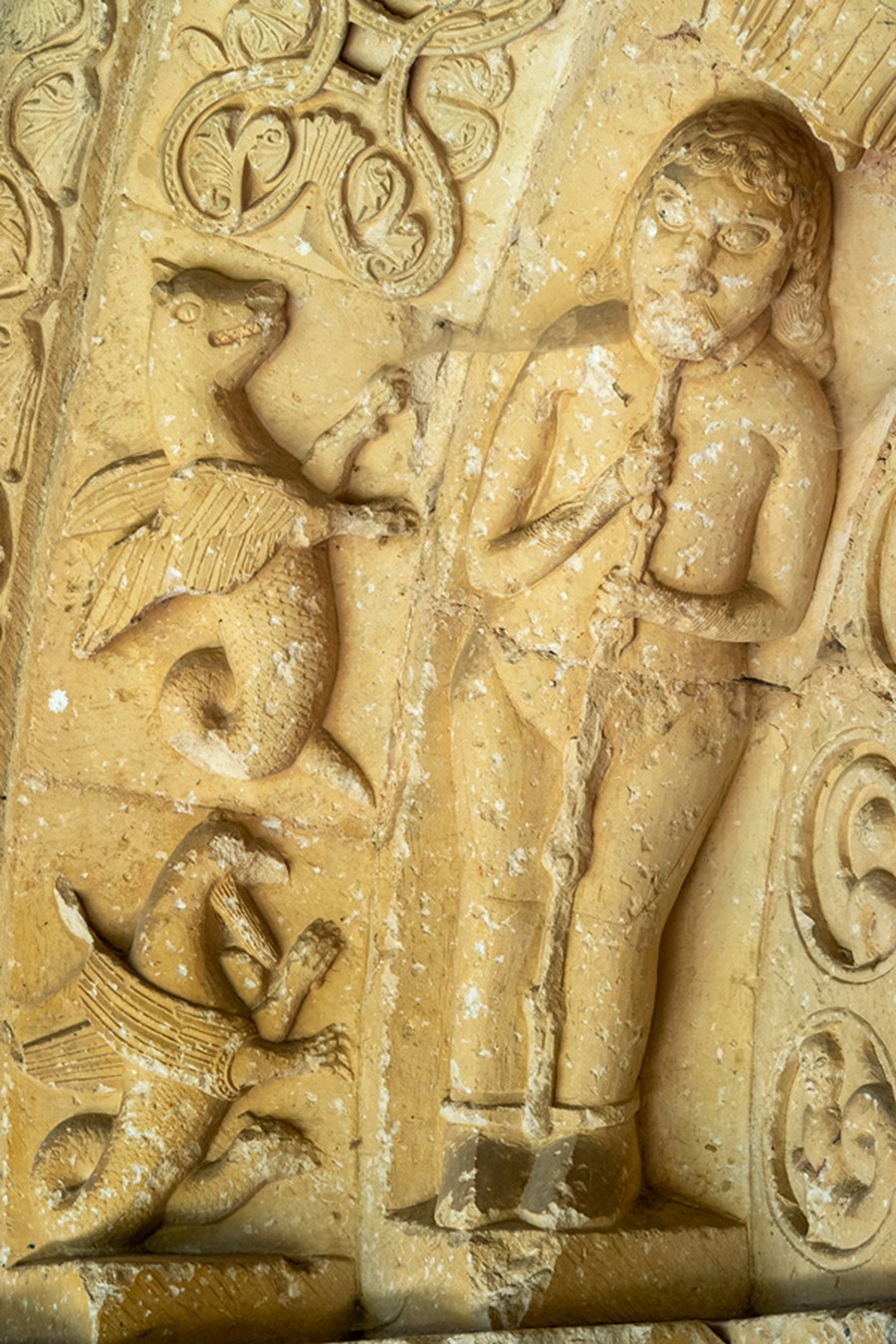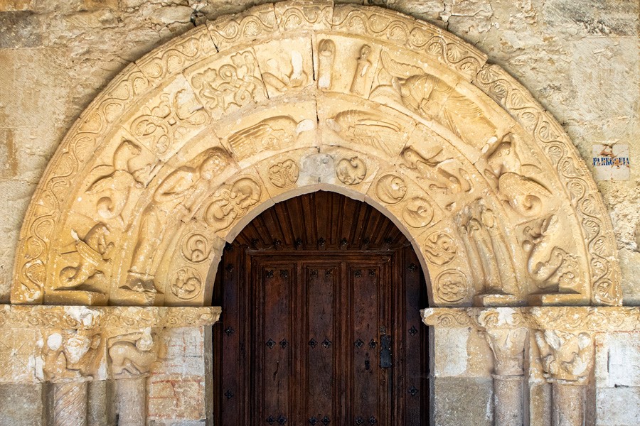 La arquivolta exterior está recorrida por varios monstruos con alas y enorme cola, algunos entrelazados geométricos y un gran ángel alado. Un guardapolvo con diseño serpenteante y cuatro capiteles y columnas completan su decoración. Encima de la portada sobresale un alero, sostenido por canecillos, en el que destaca una metopa con un relieve de Adán y Eva junto al árbol del Paraíso.