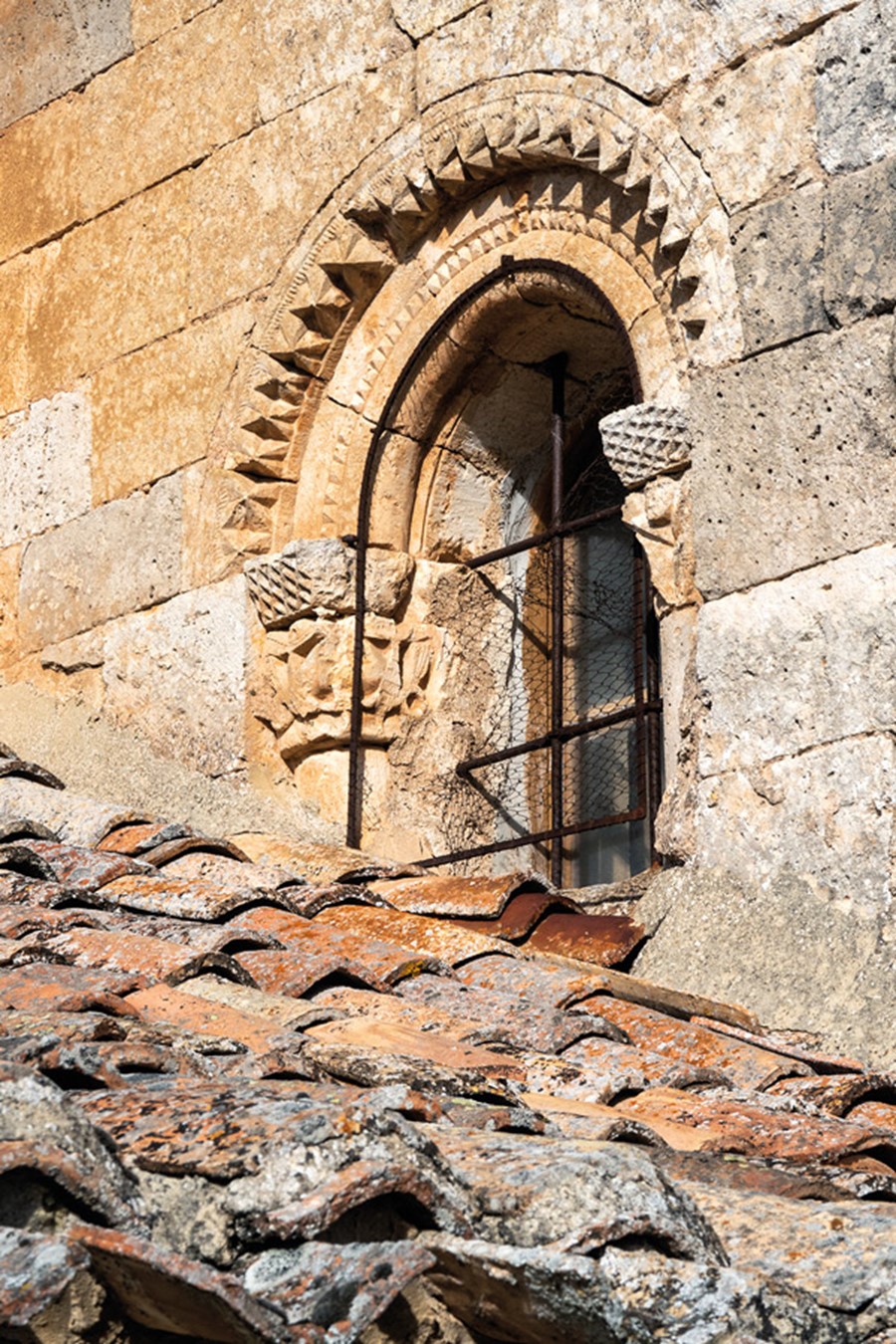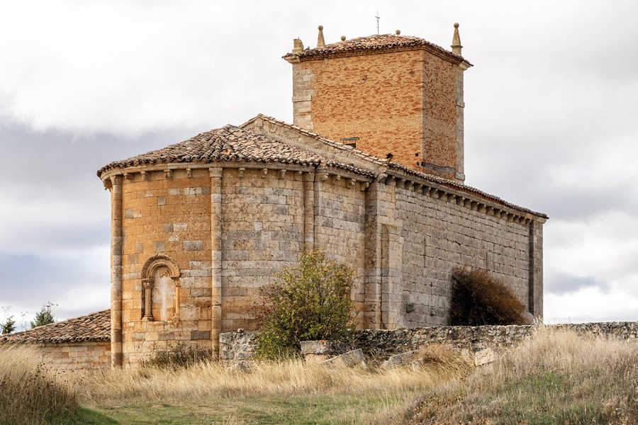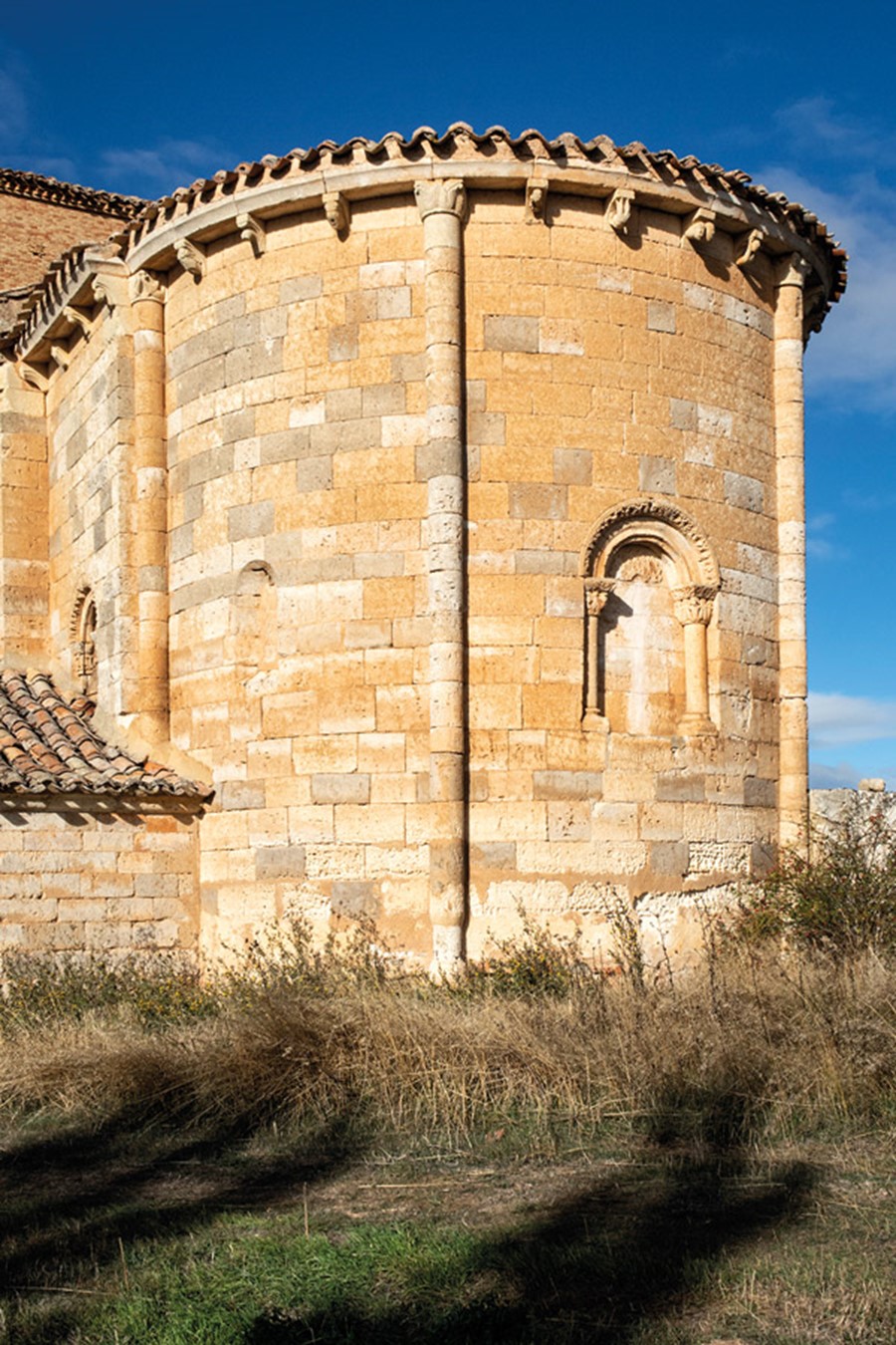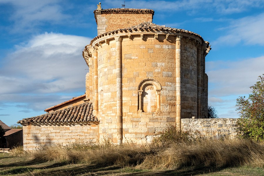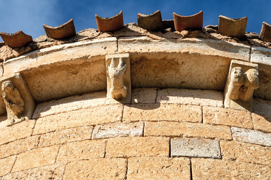 La cabecera de la iglesia conserva toda la pureza y elegancia concebida por los maestros canteros y escultores que intervinieron en su construcción. El clásico ábside semicircular que remata el conjunto se divide en tres paños separados por columnas entregas, que recorren los muros desde el suelo hasta el alero. Los capiteles de estas columnas se integran con armonía entre los once canecillos que decoran el hemiciclo.
