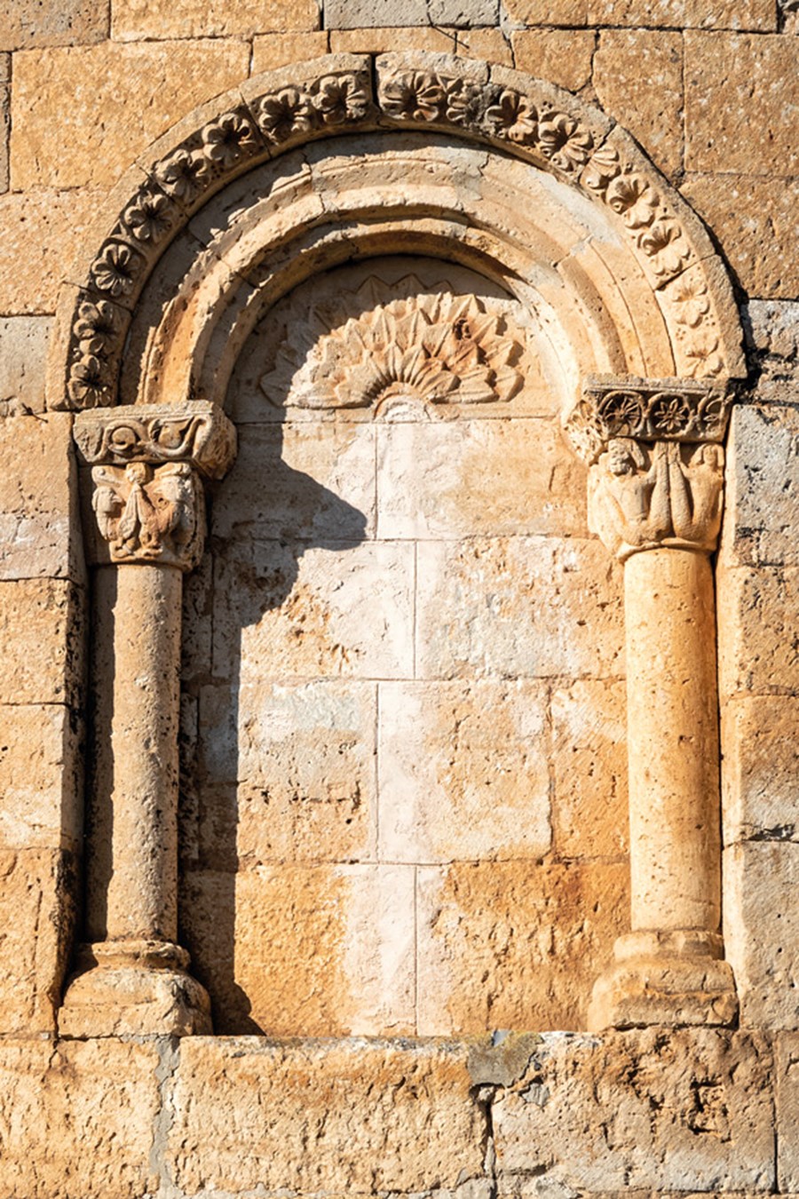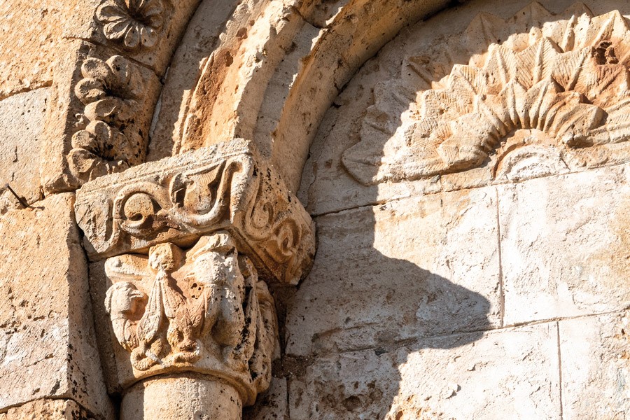 Los capiteles de las dos columnas del cegado vano están decorados con sendas representaciones. Mientras el de la izquierda muestra dos enfrentadas parejas de grifos —animal fantástico con cabeza de águila y cuerpo de león—; en el de la derecha, están esculpidas tres sirenas que sostienen entre sus manos sus dobles colas escamadas. En el arte románico las sirenas, cuerpo femenino y cola de pez, son la representación inequívoca de los peligrosos pecados carnales.