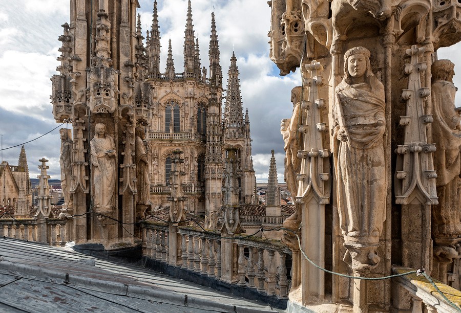 En la silueta exterior de la capilla del Condestable llaman la atención los pináculos erigidos como remate de la capilla funeraria por el propio Simón de Colonia a finales del siglo XV. La conjunción de estos airosos chapiteles con los grandes y alargados ventanales dan la impresión de vencer la fuerza de la gravedad y lanzar hacia arriba todo el poderoso volumen de la edificación.