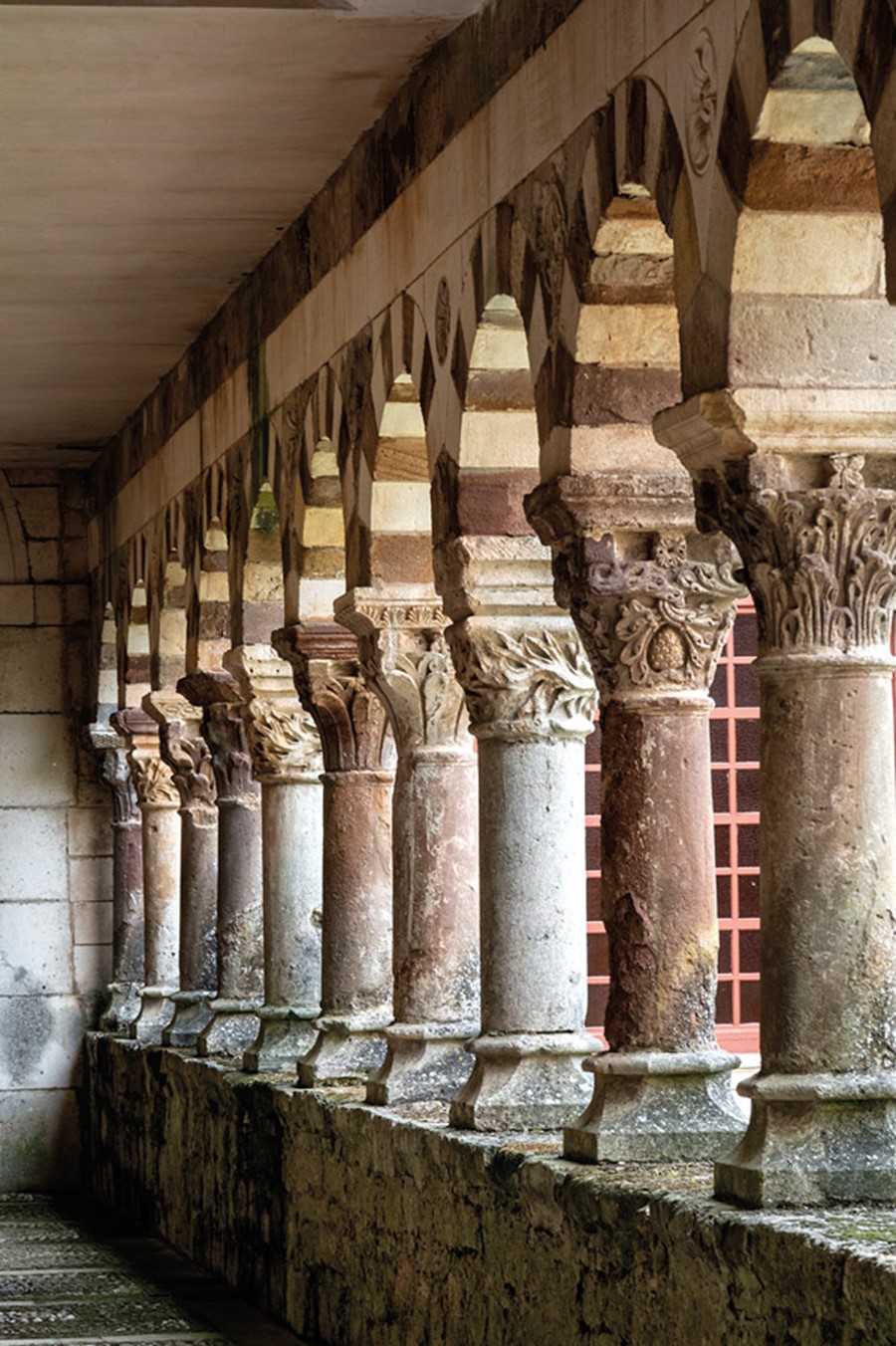 Desde siempre ha llamado la atención en los arcos de medio punto del claustro de Cardeña, la alternancia de dovelas de color blanco y rojizo. Lo habitual fue atribuirles una raigambre islámica, semejante a la de los arcos de la mezquita de Córdoba, pero las últimas investigaciones se inclinan por una clara filiación borgoñona. Esta interpretación del románico fue importada por los monjes franceses que llegaron al monasterio burgalés tras su donación a la casa matriz de Cluny.