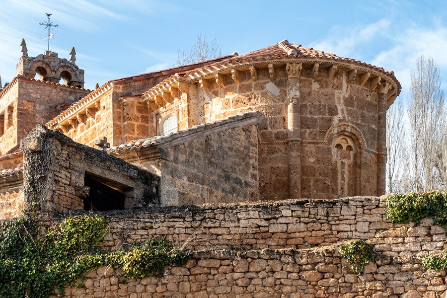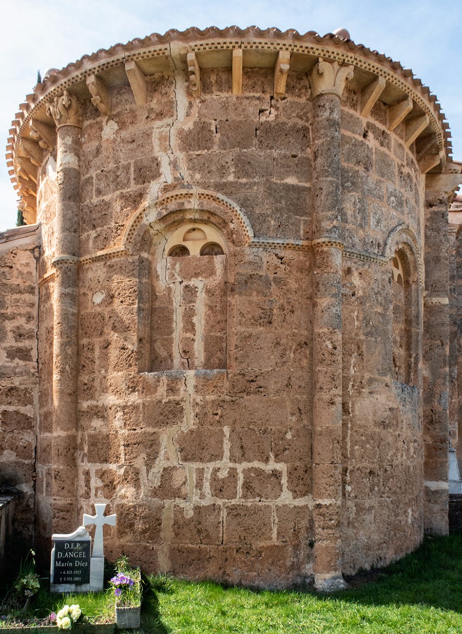 Al exterior, la cabecera también delata el corto tramo recto del presbiterio y el esbelto ábside semicircular. El hemiciclo se articula en tres paños separados por dos columnas entregas que recorren la totalidad del muro y están decoradas con sendos y bien ejecutados capiteles. En cada uno de los lienzos del ábside se abre un vano. Los tres, enlazados por un decorativo guardapolvo, están cegados y no presentan columnas ni capiteles. Su único ornamento son los tres arquillos de medio punto esculpidos en sus macizos tímpanos.