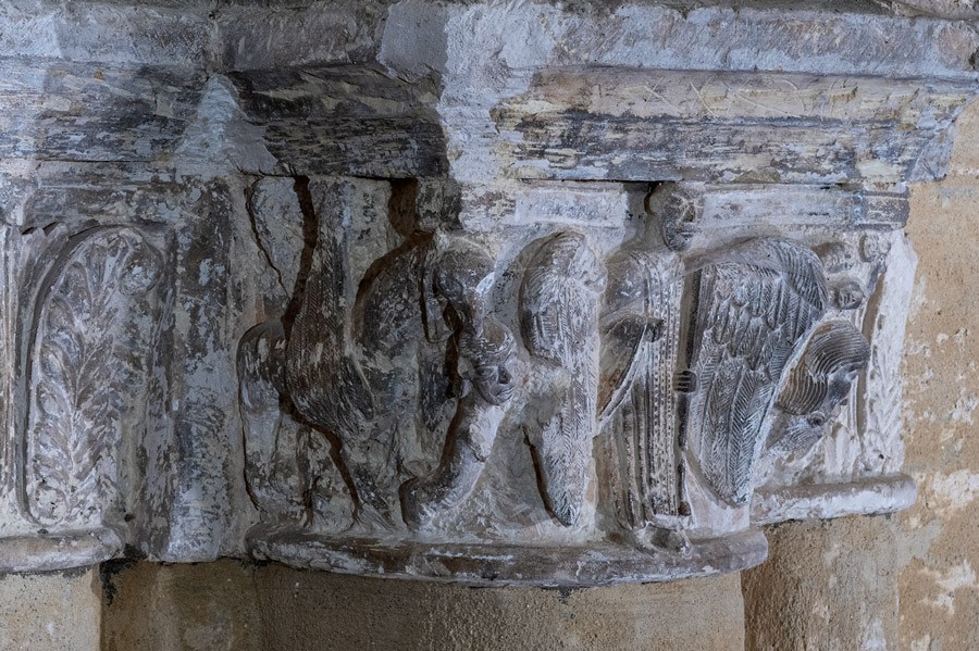 Entre los capiteles del interior, que son triples por las tres columnas sobre las que descansan los arcos fajones dobles, destaca el central que luce sus tres caras esculpidas con ángeles desplegando sus grandes alas, un águila devorando una presa y un solemne busto humano.