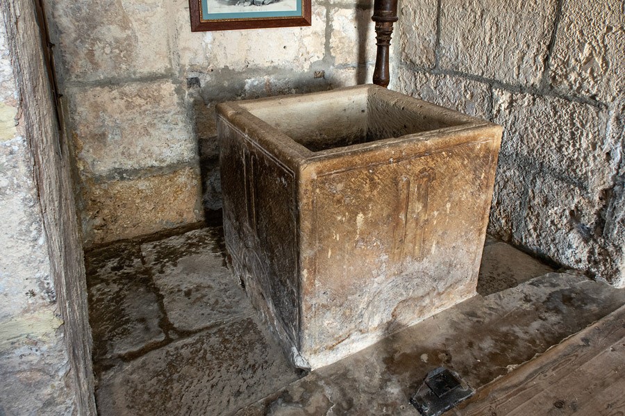 Una de las sorpresas de esta iglesia es su original pila bautismal románica. Presenta copa cuadrada y sus tres frentes visibles están decorados —mediante simple incisión— con dos estrechos arquillos verticales y uno horizontal que sirve de base y semeja una fuente o una puerta.