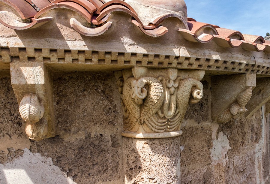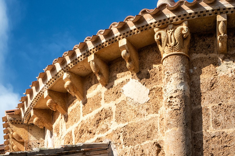 Entre los numerosos canecillos que sostienen la cornisa de las naves y la cabecera destacan, sobre el muro meridional del ábside, los que representan tres bustos: una mujer entre dos hombres barbudos. También merece una mención el capitel de la columna adosada meridional del ábside con dos refinadas parejas de águilas afrontadas y de ondulantes cuerpos. Aunque la labra del artista es algo dura, su ejecución está muy cuidada y el resultado muy vistoso.