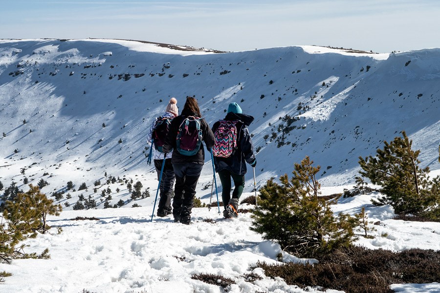 Cuando la nieve cubre el paisaje y obliga a cerrar la carretera de acceso a las lagunas, la ruta comienza en el aparcamiento del puerto del Collado. Caminando por la nieve —aunque no son imprescindibles ayudan unas raquetas— que cubre la pista se asciende hasta la laguna de la Cascada. Es la de más baja cota, 1.690 metros, de todo el conjunto lagunar de Neila y uno de los rincones más bellos y espectaculares de la amplia naturaleza burgalesa.