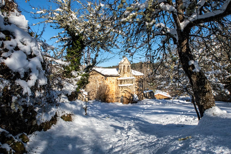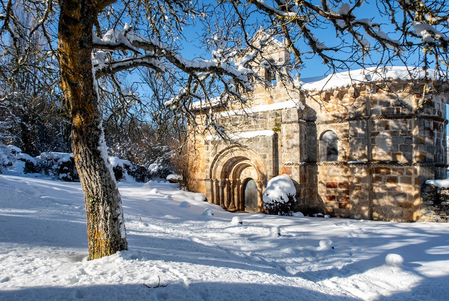 Crespos conserva también un interesante templo de estilo románico datado en una inscripción en su muro meridional y que revela que Pascasio plantó el huerto el 27 de abril de 1147. La iglesia presenta bóveda de medio cañón y un ábside semicircular que en su interior se halla recorrido por una ciega arquería de gruesas molduras. Con ligeras influencias de San Pedro de Tejada, en su decoración escultórica se pueden contemplar leones, águilas enfrentadas y mujeres con serpientes mordiéndoles los pechos. Cuenta con una sencilla pila bautismal también románica.