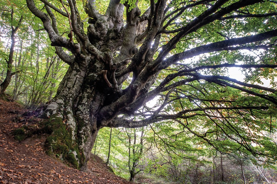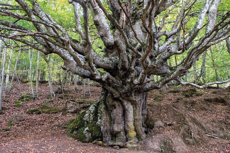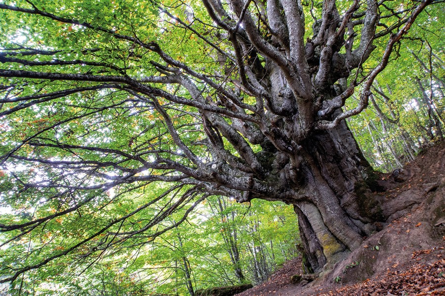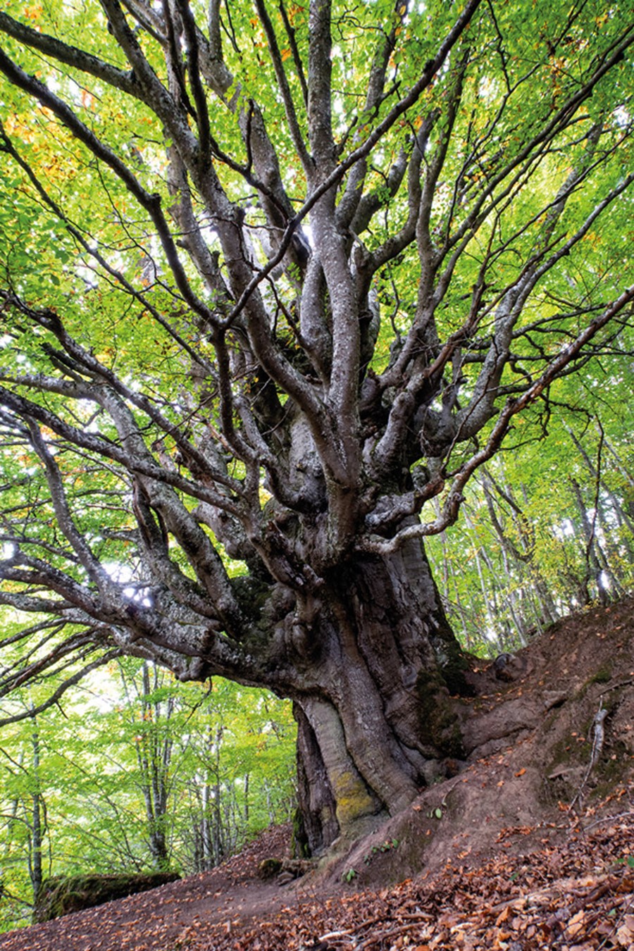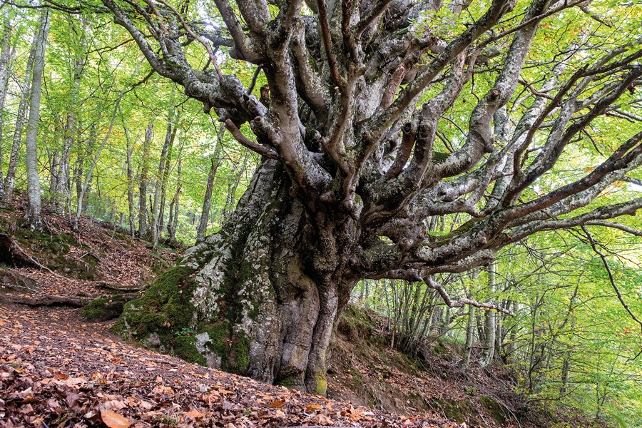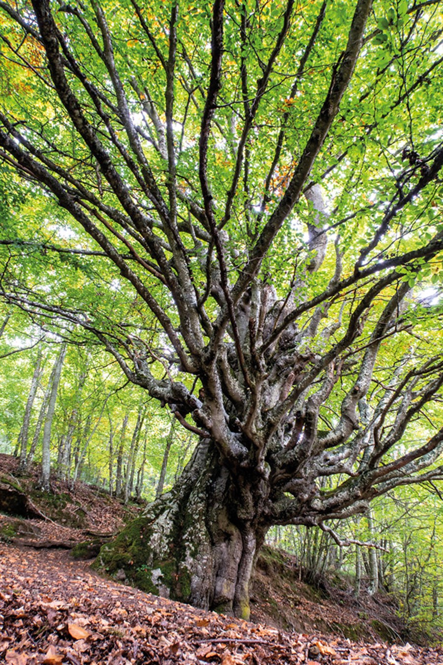 Y para rematar el conjunto, del centro de esta especie de ramo gigantesco se alza un rotundo y grueso tronco principal que, como un coloso lígneo repleto de muñones y recovecos, alcanza los casi 20 metros de altura. La densa sombra creada por la enorme copa de este árbol, una característica de todas las hayas centenarias, impide que a su alrededor apenas crezca ninguna otra planta. Eso da lugar a un espacio despejado que permite rodear el árbol con comodidad y darse cuenta de que desde cada punto de vista cambian totalmente su forma y sus proporciones.