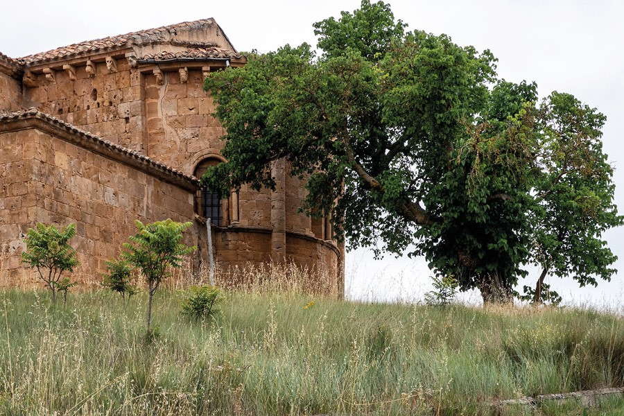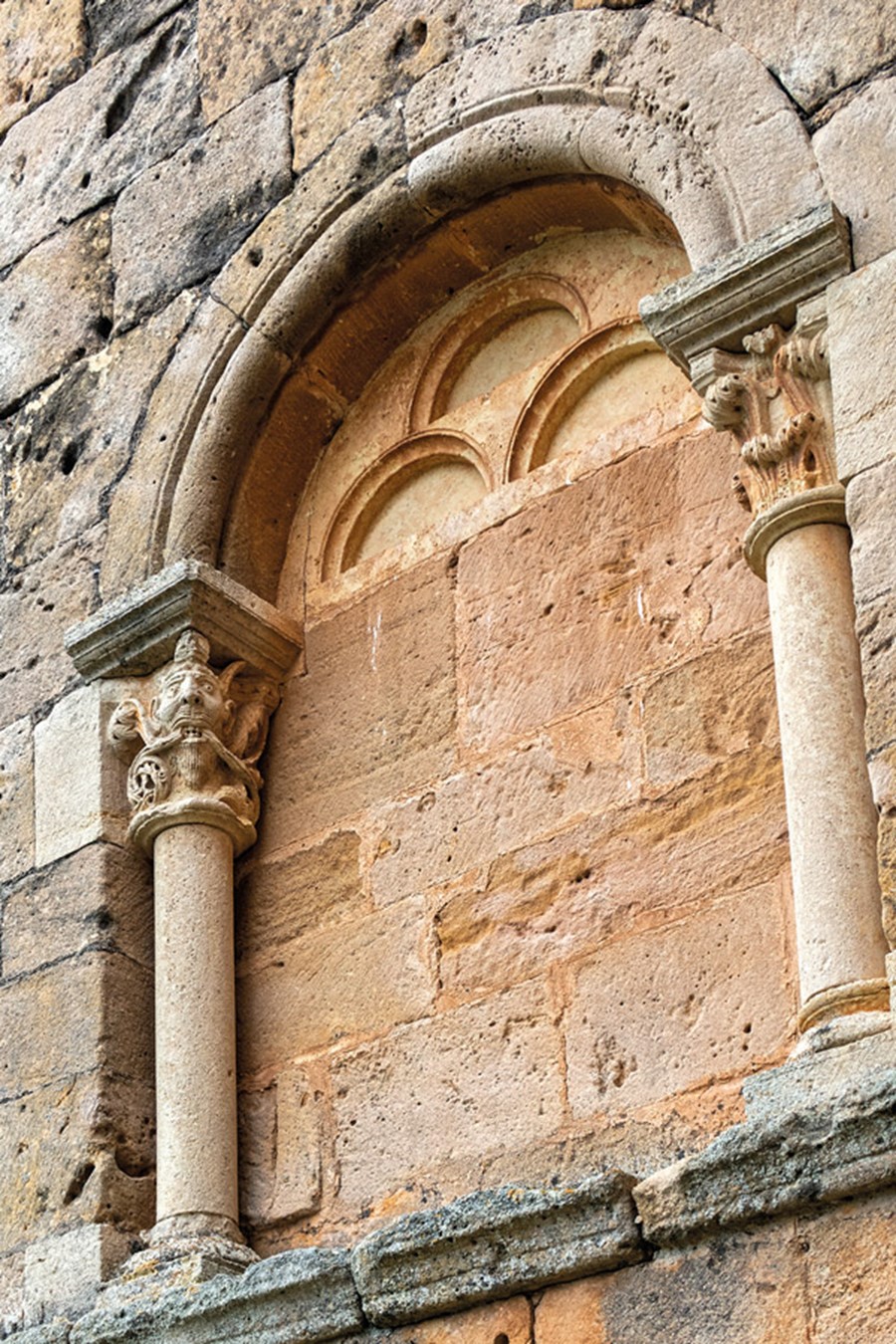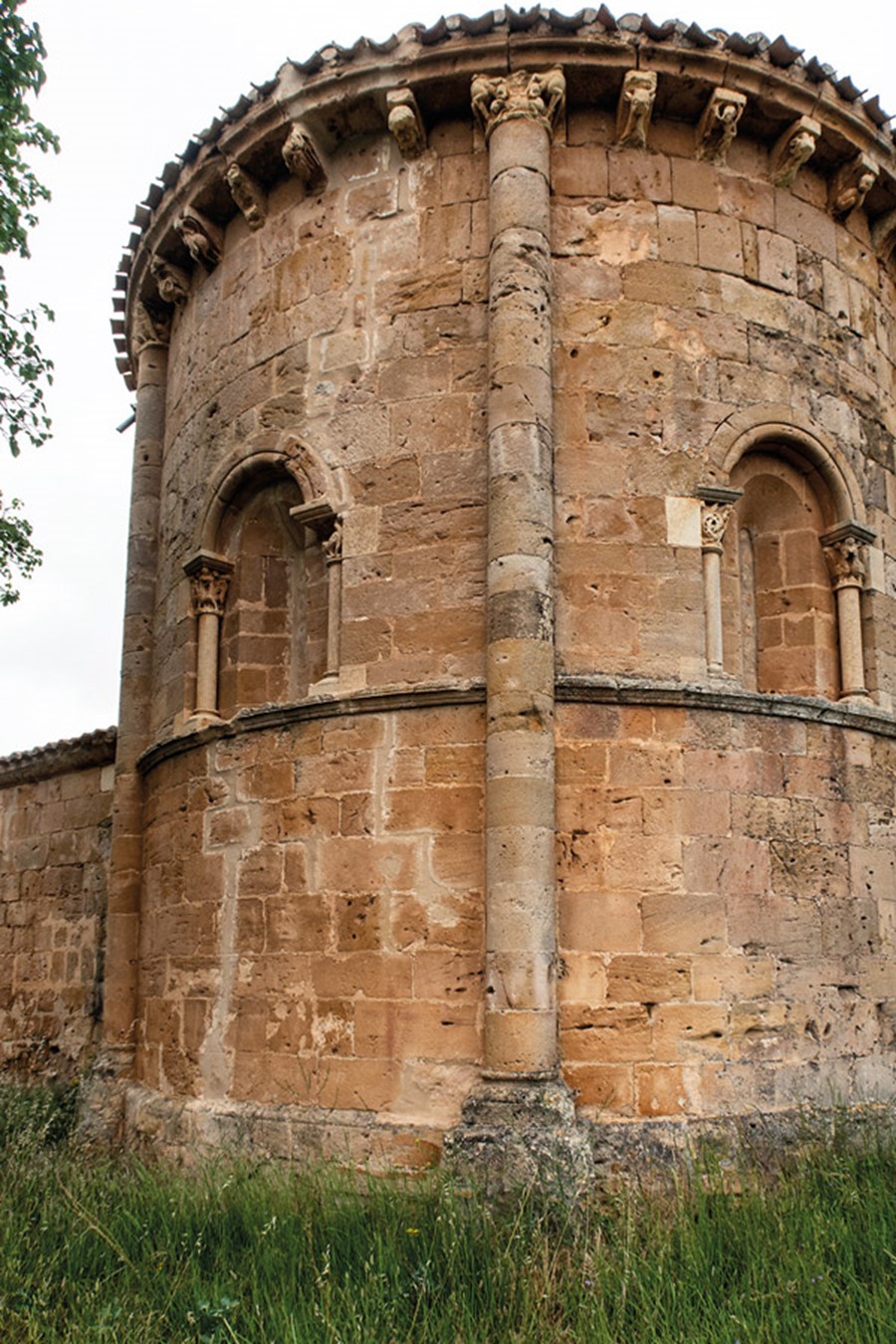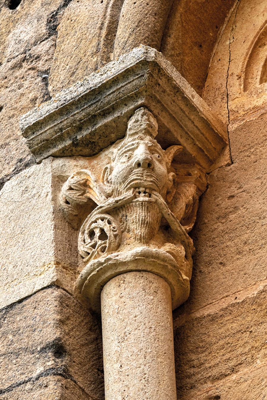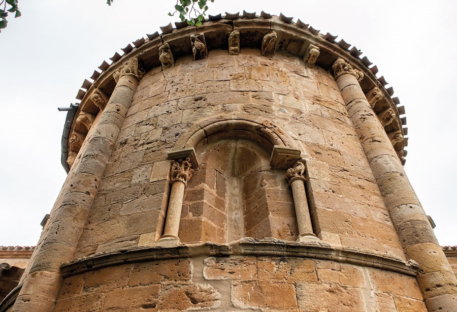 Merece la pena detener la mirada en el capitel que representa una diabólica máscara de cuya boca brotan unos retorcidos tallos que terminan en unos primorosos remates vegetales. Esta pericia formal que demuestra uno de los maestros románicos de Hermosilla —los expertos hablan del maestro de Abajas—se va a repetir en los variados capiteles que decoran tanto el exterior como el interior de la cabecera románica.