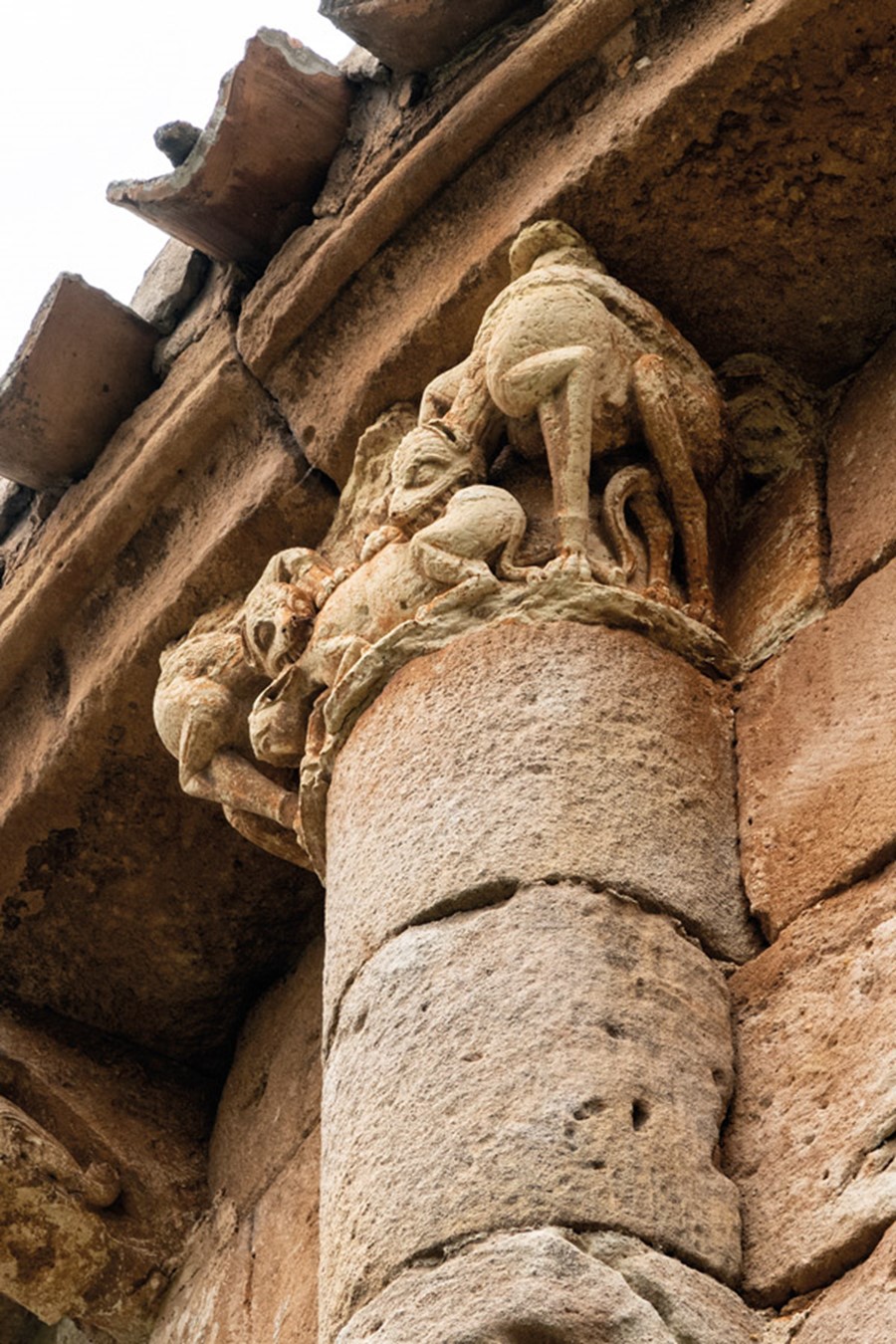 Pero además en el exterior de la cabecera de Hermosilla podemos admirar la obra escultórica dejada por un segundo artista conocido como maestro de Cerezo de Río Tirón. Lo primero que llama la atención es la variedad y calidad desplegada en los numerosos canecillos que coronan los muros del ábside y el presbiterio. Todos son admirables, pero por mencionar algunos destacaremos los bustos masculinos, distintos seres fantásticos y las representaciones de distintos animales, tanto domésticos como salvajes.