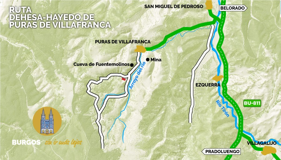 La carretera de Logroño, N-120, permite llegar desde Burgos hasta Belorado. Allí hay que tomar la carretera local que enfila hacia Pradoluengo. Tras recorrer unos cinco kilómetros se localiza la desviación que conduce hasta Puras de Villafranca. Para llegar hasta su dehesa hay que tomar el camino que se dirige hacia las recuperadas Minas de Manganeso y la Cueva de Fuentemolinos.