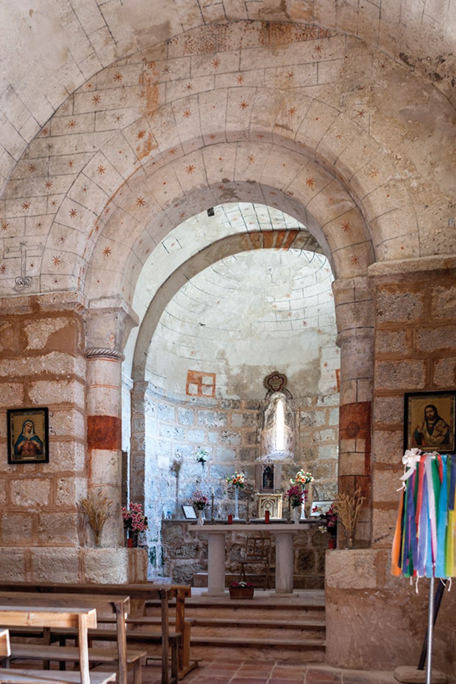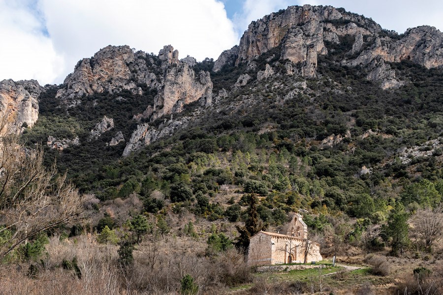 El interior de esta pequeña iglesia mantiene bastante bien su primitiva fábrica románica y apenas ha sufrido añadidos y modificaciones. La nave, que se cubre con bóveda de cañón ceñida por arcos fajones de medio punto, se abre al presbiterio, también cubierto por bóveda de cañón, mediante un arco triunfal doblado. El ábside está cubierto con bóveda de horno.