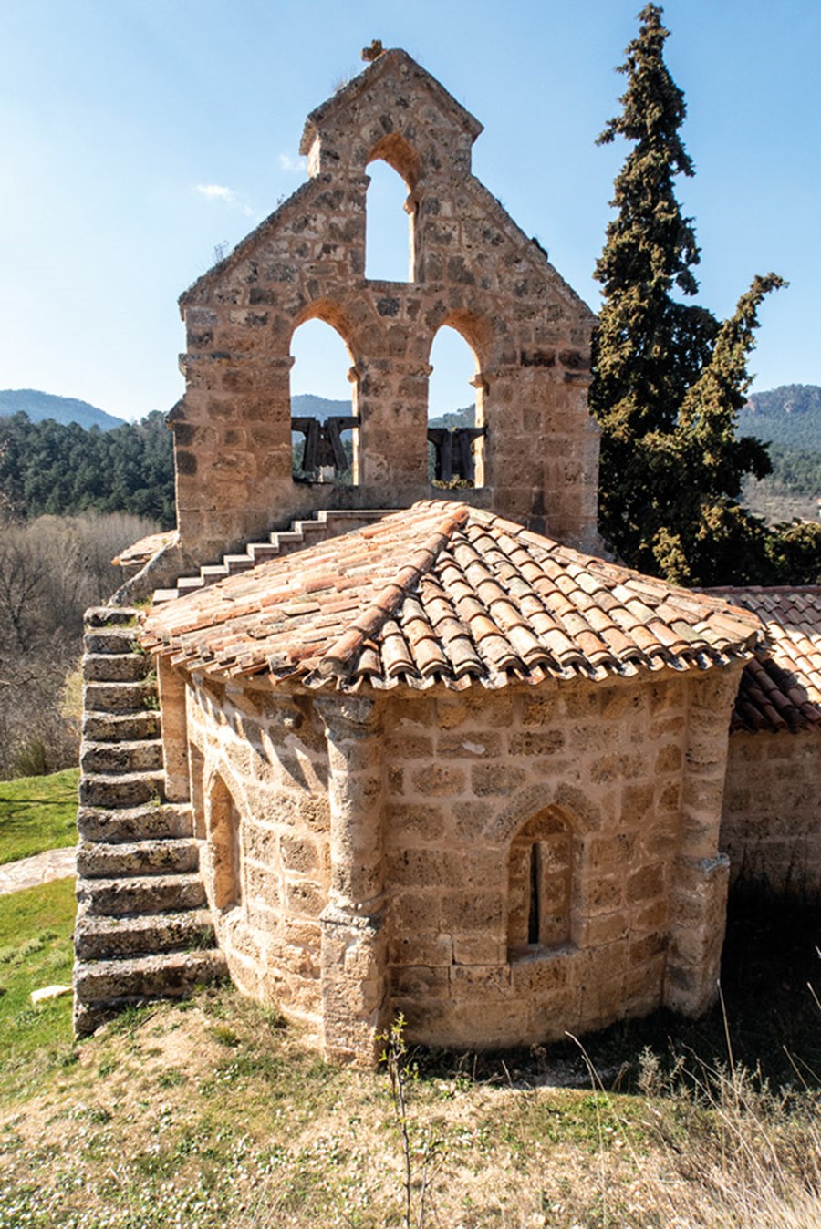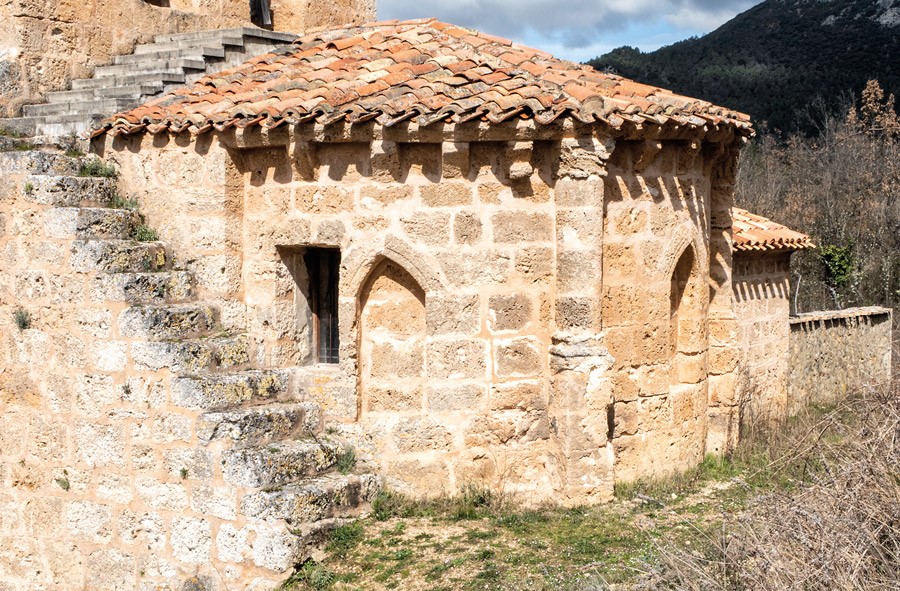 El ábside que remata la cabecera tiene planta semicircular, se articula mediante codillo y para adaptarse al desnivel de la ladera sobre la que asienta el sagrado edifico se encuentra un poco más alto que la nave y el presbiterio. Al exterior muestra tres tramos separados por pilastras que sostienen semicolumnas rematadas por unos capiteles con figuras humanas desfiguradas por la erosión de la toba. Cada uno de los tres paños del ábside se decora con su correspondiente arco apuntado de aristas aboceladas. El central es el único que cuenta con una abocinada y rasgada ventana que ilumina el interior. La cornisa achaflanada descansa sobre canecillos decorados con nacela.