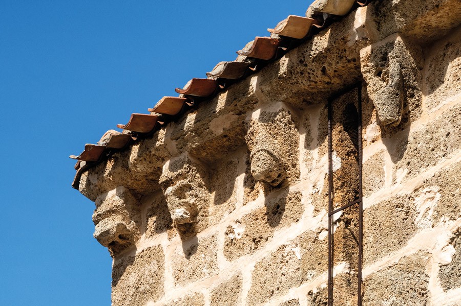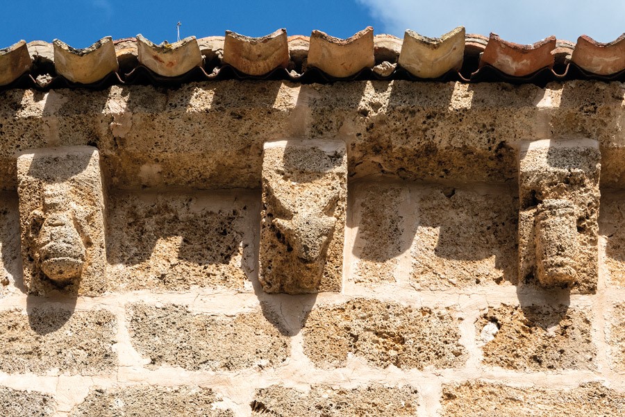La única decoración de la fachada meridional es la serie de canecillos que sostienen la cornisa. Un poco toscos, por la dificultad para tallar la toba, muestran un repertorio en el que se pueden identificar bóvidos, aves, lobos y algunos rostros humanos, cubiertos con distintos tocados cónicos.