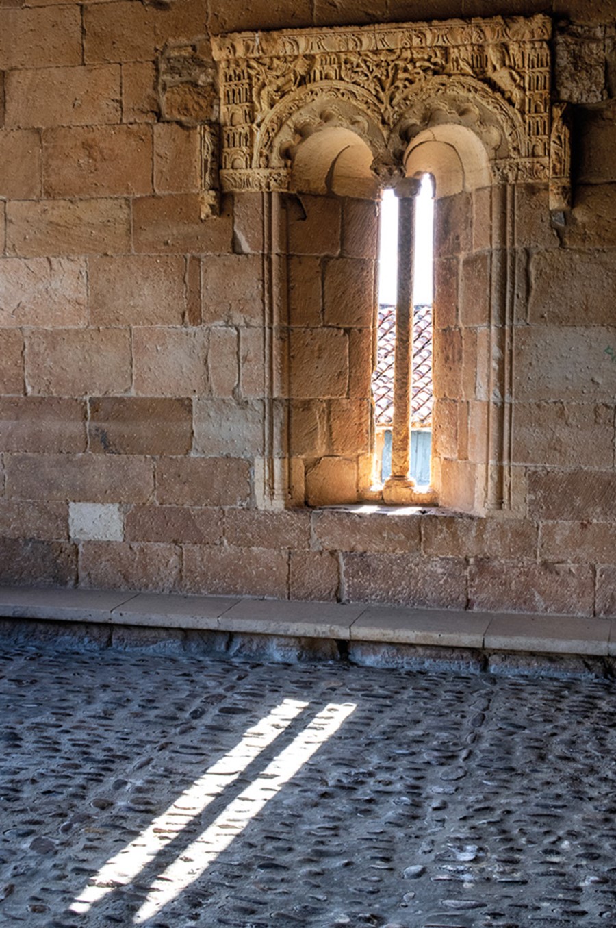 En el muro occidental del pórtico se abre una llamativa ventana ajimezada que constituye la cumbre escultórica de toda la galería. En ella, además de la fecha y la firma del autor se puede contemplar una original representación de la tentación de Adán y Eva en el Paraíso Terrenal. Por su cuidada ejecución, que recuerda las miniaturas y los eborarios mozárabes, y por sus diversos motivos decorativos, la ventana tiene un singular aire orientalizante.