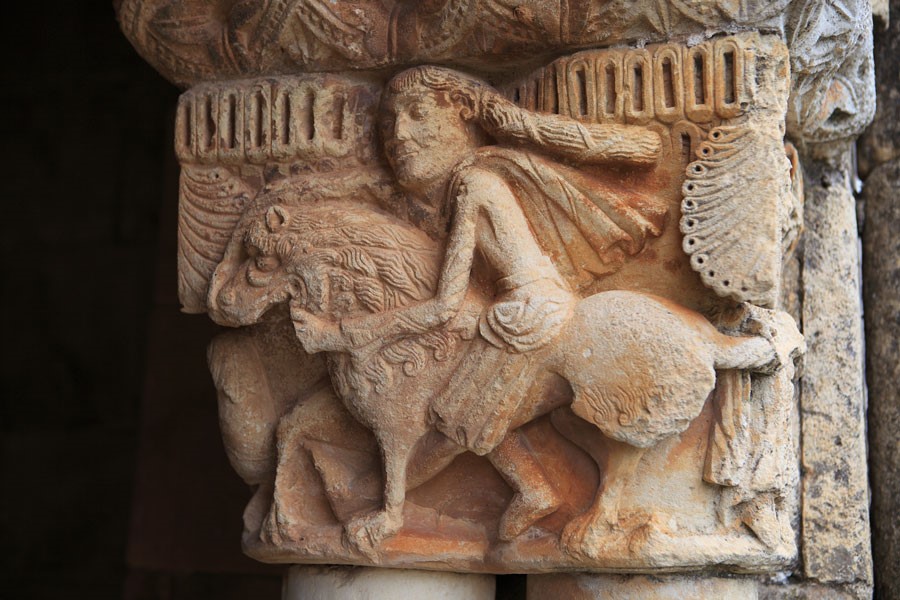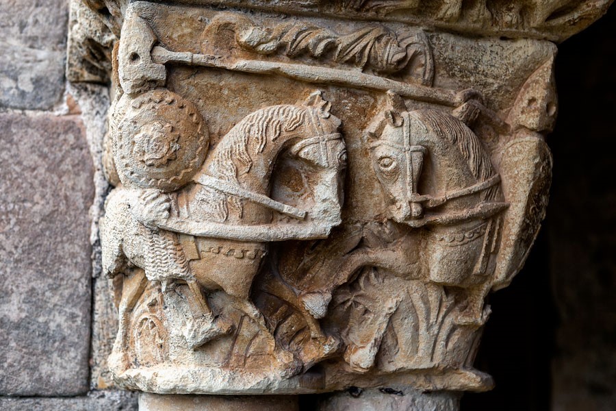 La escultura que decora los distintos elementos de la galería denota una alta calidad y una gran maestría en su ejecución. Se trata de un arte maduro y evolucionado que en algunos aspectos muestra ligeras influencias de la escuela silense. En los capiteles se puede contemplar un admirable repertorio iconográfico que abarca desde los clásicos temas vegetales —hojas carnosas, pencas enrolladas y tallos vomitados por carátulas—, hasta las representaciones de seres monstruosos —grifos y animales fantásticos con cabezas humanas—, pasando por las luchas entre caballeros y las consabidas escenas bíblicas: Sansón abriendo las fauces de un león, San Miguel pesando las almas y, en la pieza más curiosa de todas, la tentación y muerte del usurero.