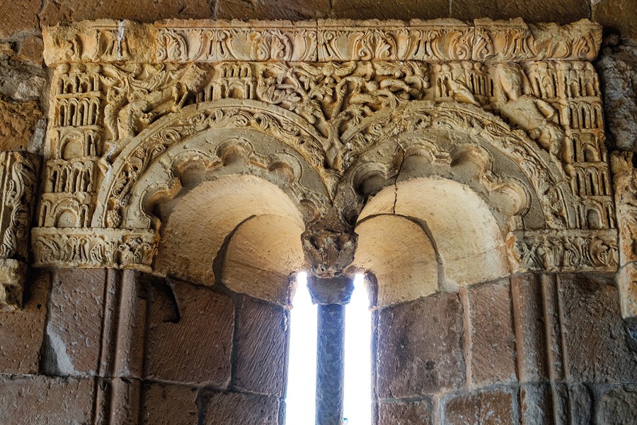 Si al exterior se puede leer la fecha y la firma del autor, al interior del pórtico la ventana ajimezada muestra una original representación de la tentación de Adán y Eva en el Paraíso Terrenal. Por su cuidada ejecución, que recuerda las miniaturas y los eborarios mozárabes, y por sus diversos motivos decorativos, la ventana tiene un singular aire orientalizante.