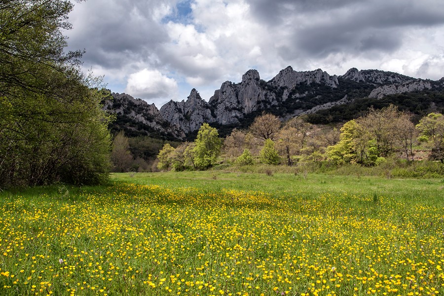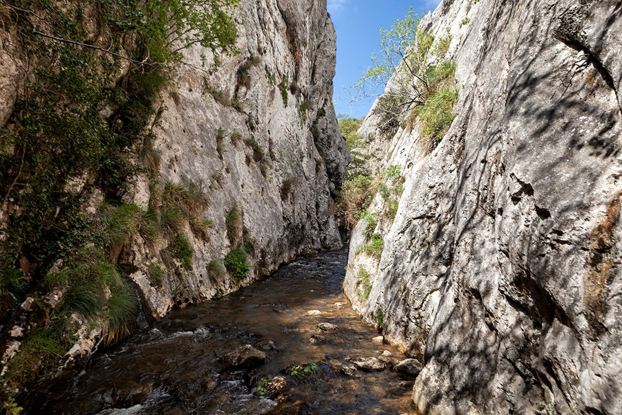 Unas piedras estratégicamente situadas permiten acceder a una zona más ancha en la que el camino asciende unos metros y se sitúa en el centro de un impresionante escenario presidido por unos afilados riscos calizos.