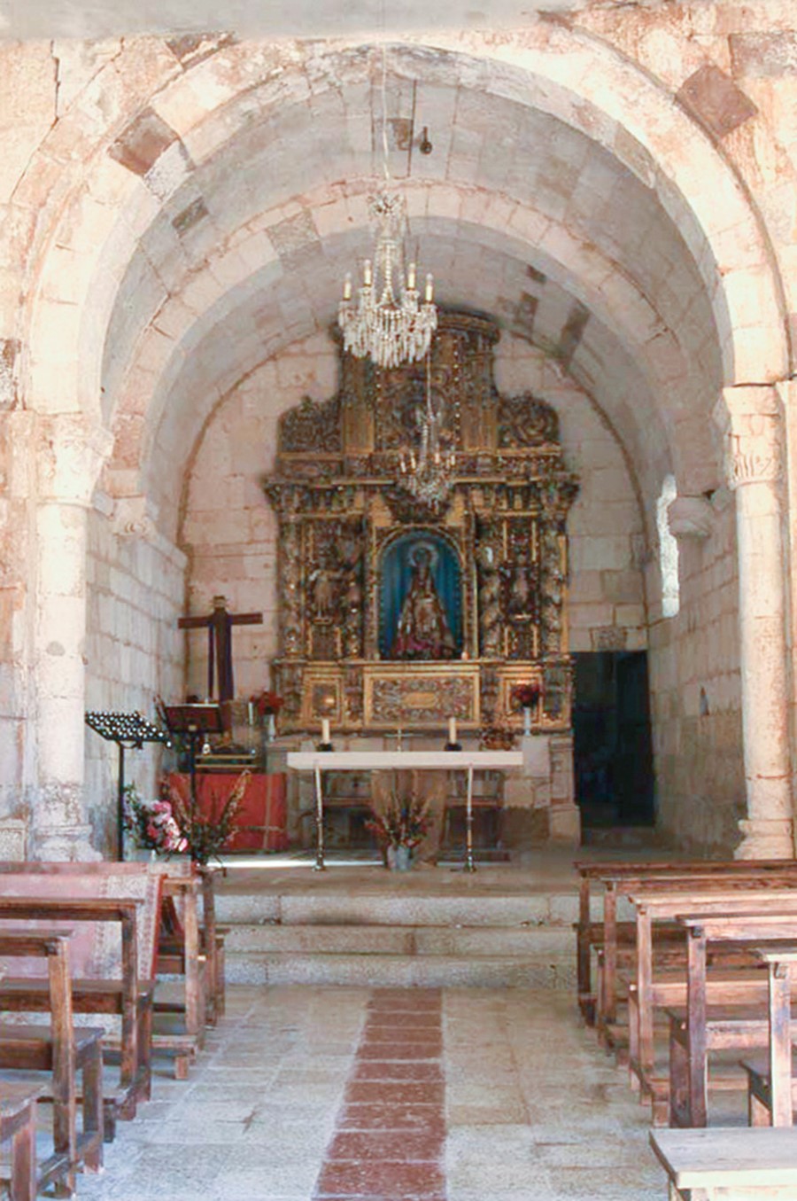 En el interior de la ermita, cubierta en algunos tramos con bóveda de cañón, llaman la atención los expresivos cuadrúpedos y las grotescas cabezas humanas y de animales que aparecen esculpidos en las ménsulas que sostienen una decorativa imposta con triple hilera de billetes. Así mismo, en uno de los capiteles del arco triunfal sobresalen dos curiosas escenas en las que sendos mediadores impiden el enfrentamiento entre distintos guerreros a caballo.