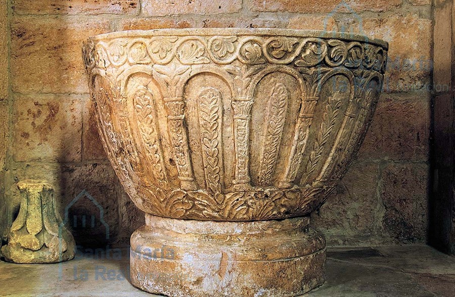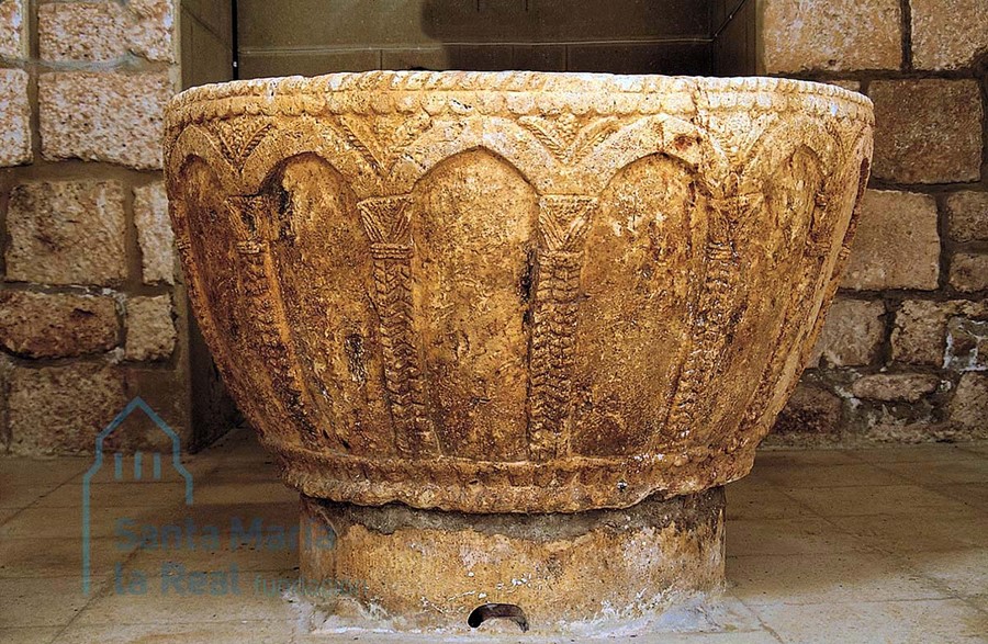 La pila bautismal de la iglesia de San Miguel tiene forma de copa troncocónica que descansa sobe un macizo pedestal. Su superficie está decorada por arcos de medio punto sobre columnas con capiteles y fustes profusamente decorados por motivos vegetales. Fechada en la segunda mitad del siglo XII el borde se decora con una cenefa de roleos con hojas y brotes.