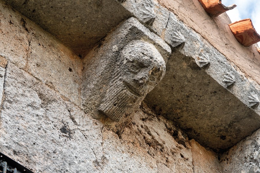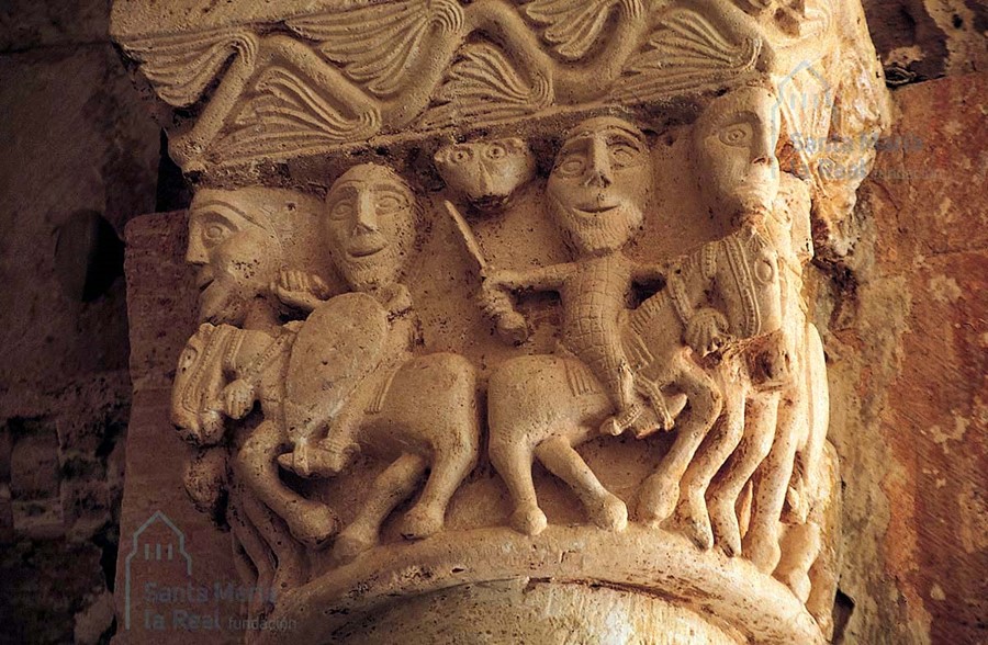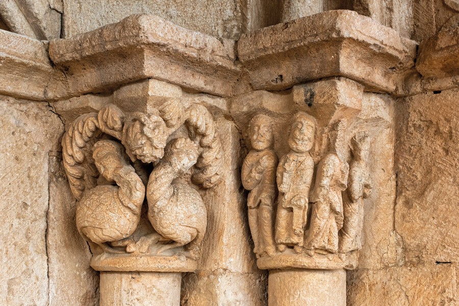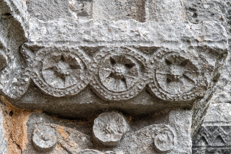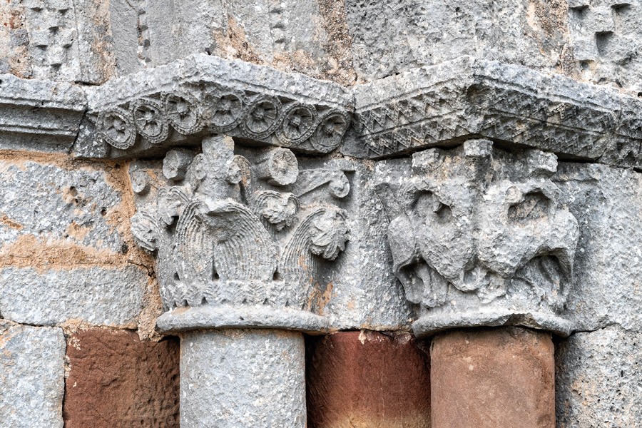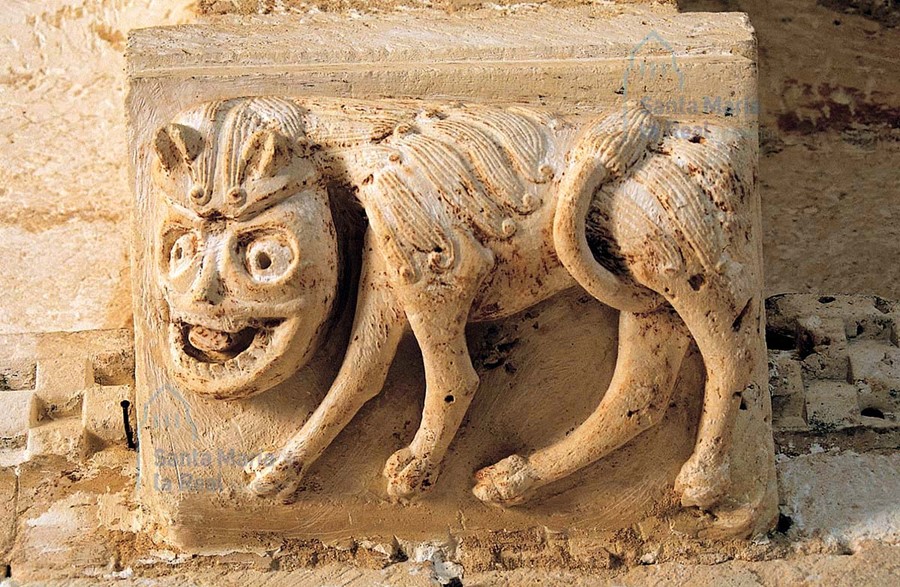 Su repertorio decorativo es variado con billetes, roleos, tallos estilizados, zigzag y círculos con flores. En sus cuatro capiteles aparecen esculpidos finos motivos vegetales, aves fantásticas y cuadrúpedos enfrentados. También es variada la iconografía representada en los canecillos que sustentan el tejado del templo.