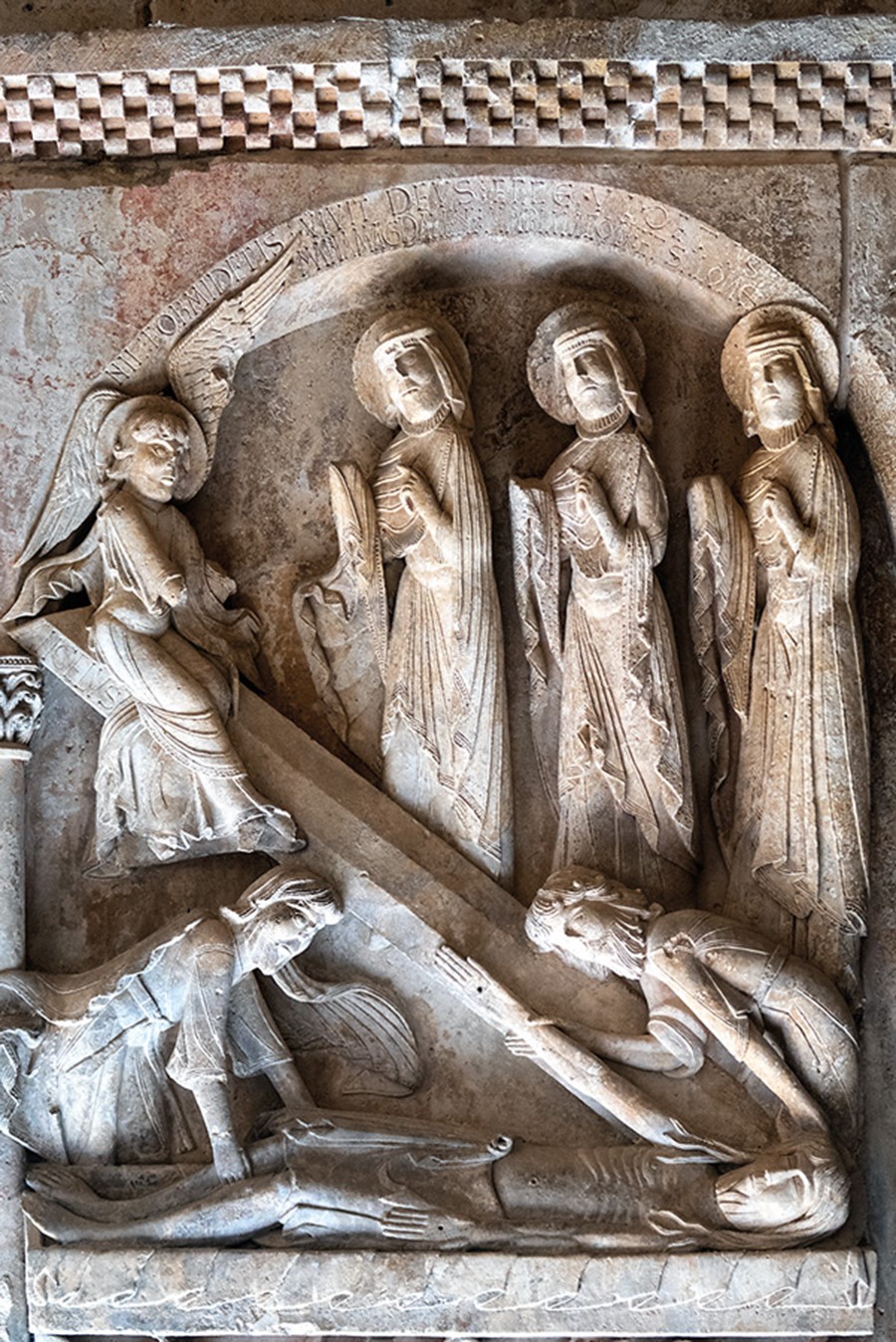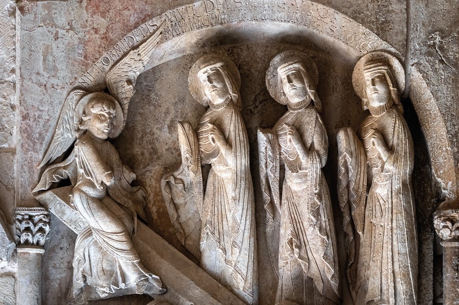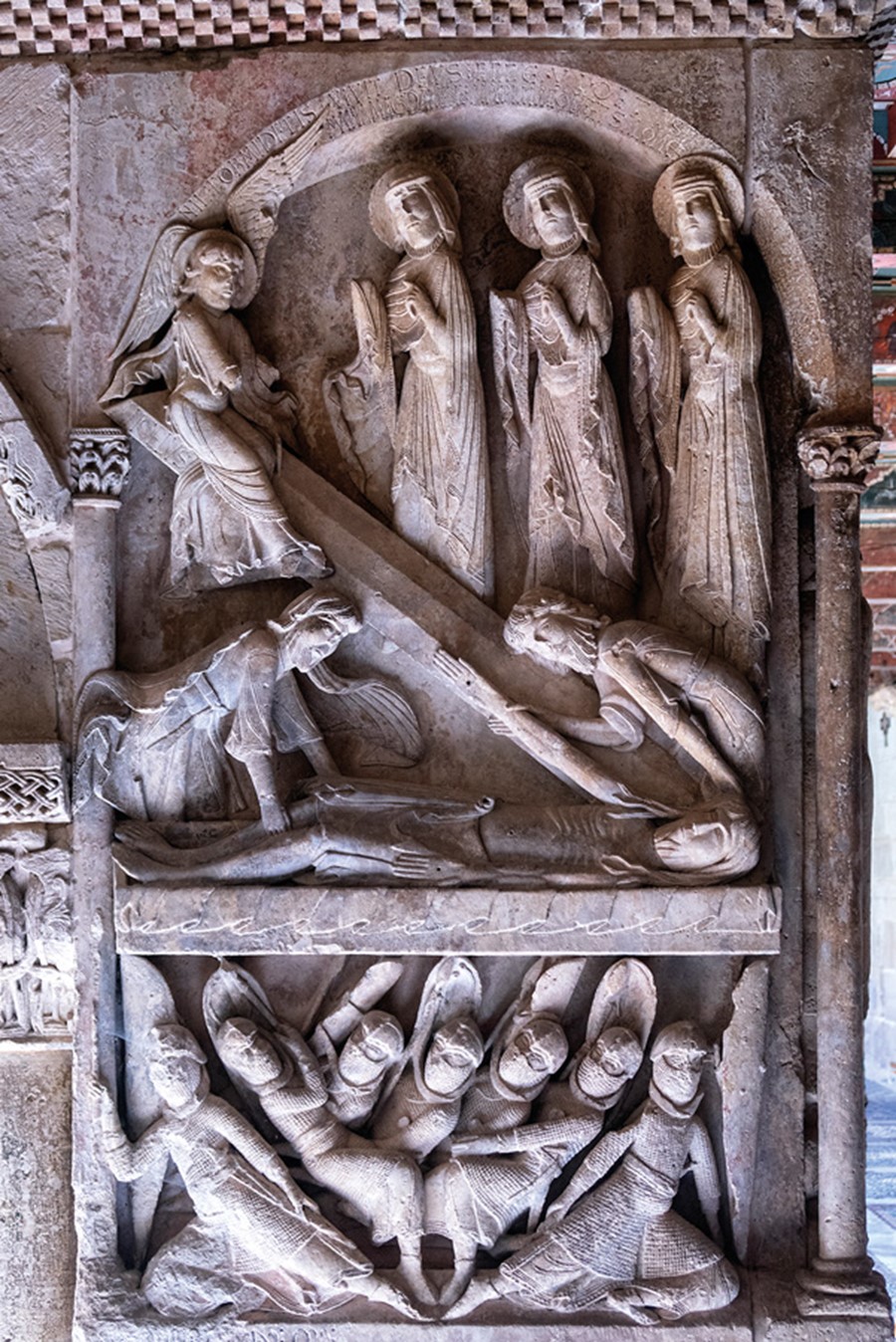 El relieve del Entierro y Resurrección de Cristo, empotrado en el machón del ángulo nororiental del claustro de Silos muestra una original representación simultánea y combinada de tres escenas diferentes y distantes unos días en el tiempo de la narración del Nuevo Testamento: el Entierro, la Resurrección de Cristo mientras los soldados duermen y la visita de las tres Marías.