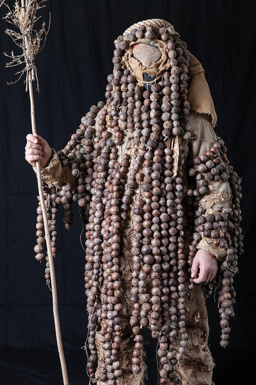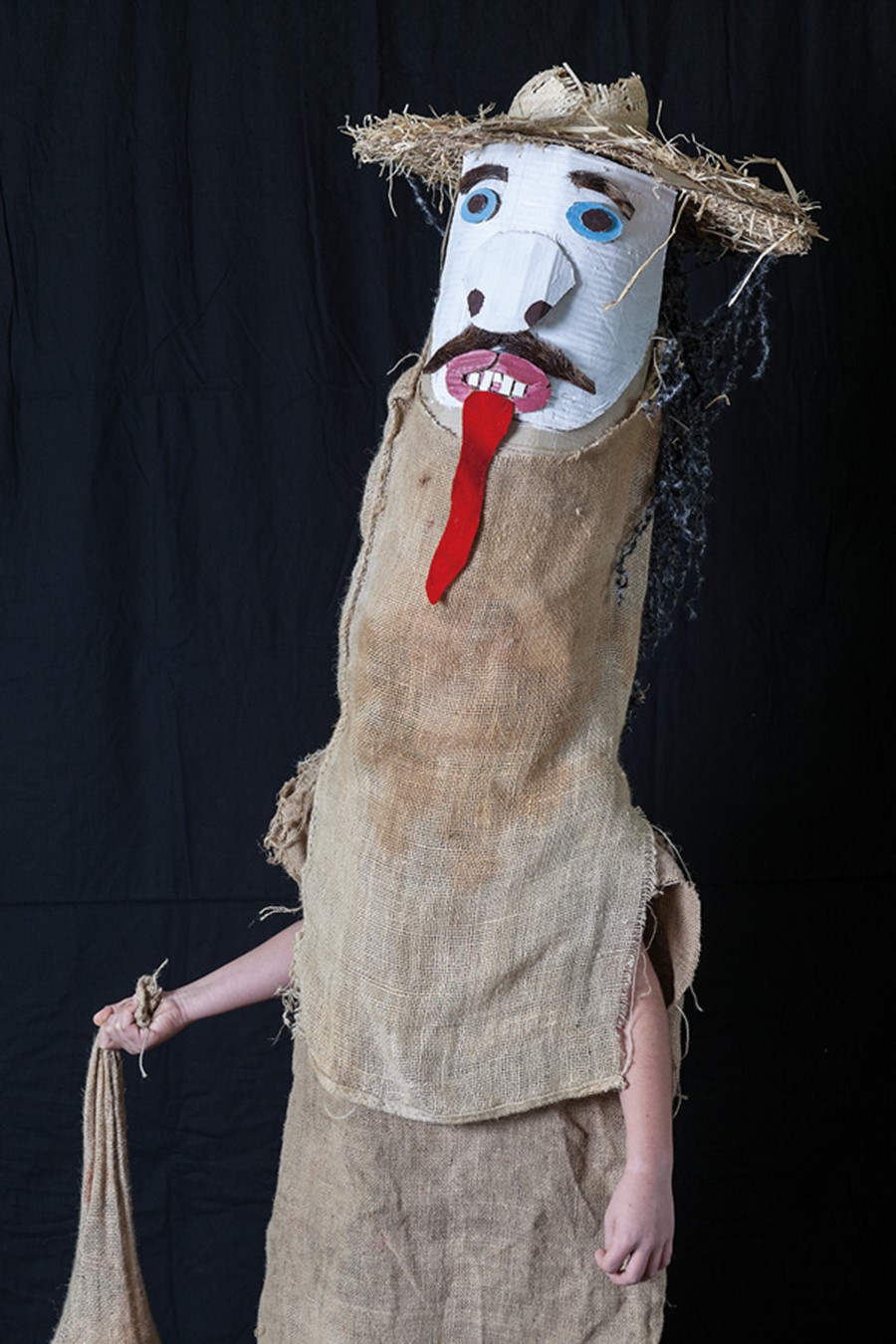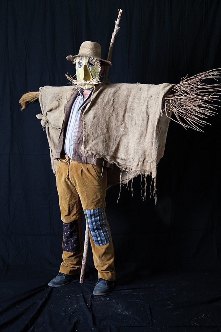 Tela de saco, ropa común, sombrero y máscara de paja tejida y ramas son los sencillos elementos que permiten recrear el clásico espantapájaros. A pesar de su aparente rigidez es una de las máscaras más temidas por sus largos y afilados dedos.
