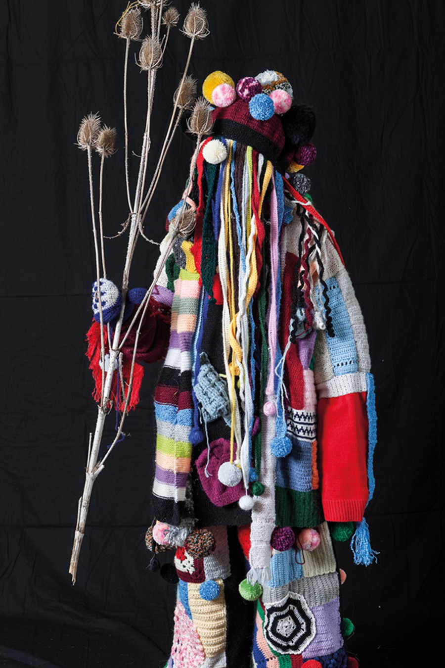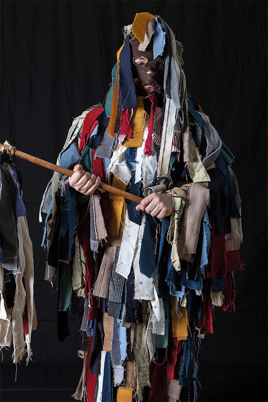 Con restos de prendas tejidas con lana de vivos colores, retales de vestidos y cardos está máscara es una evolución más moderna del disfraz del trapero.