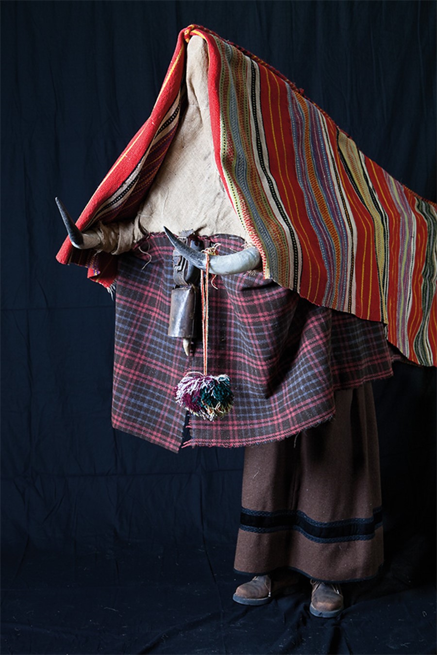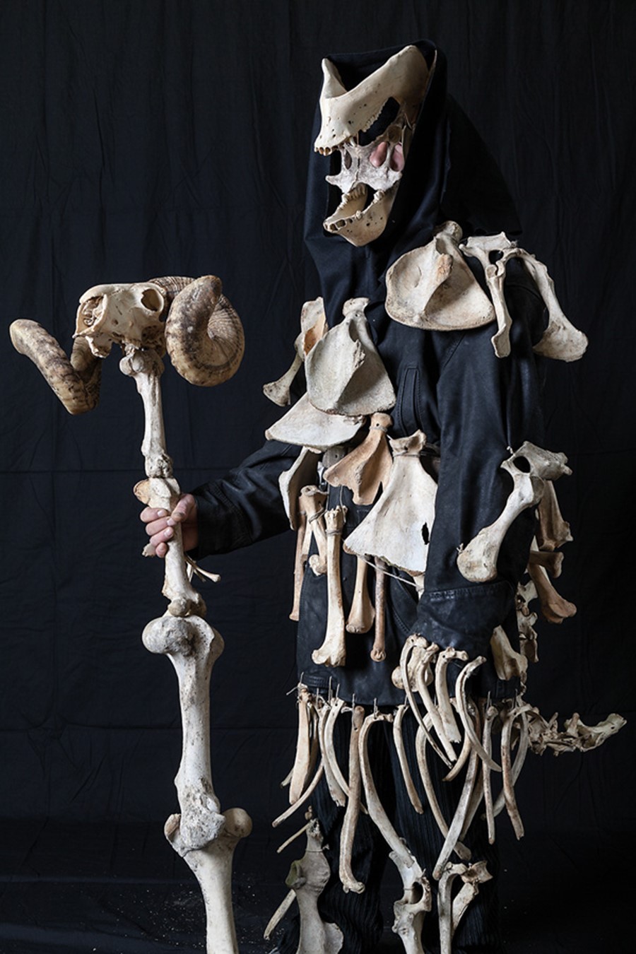 Elaborada con cráneos, cornamentas, huesos de animales —todos ellos encontrados en los muladares en los que se alimentan los buitres de la zona— y chaquetón de cuero es una de las máscaras que más impresiona de todo el conjunto.