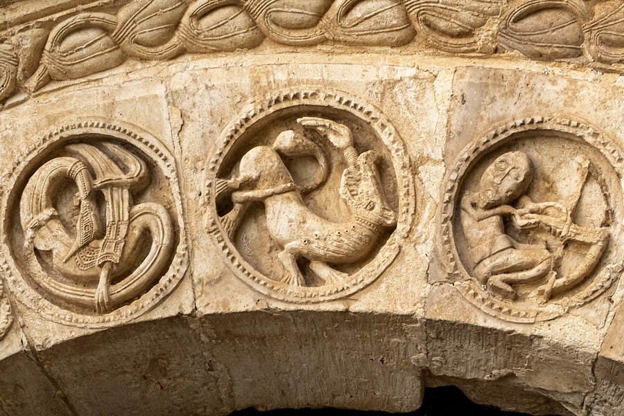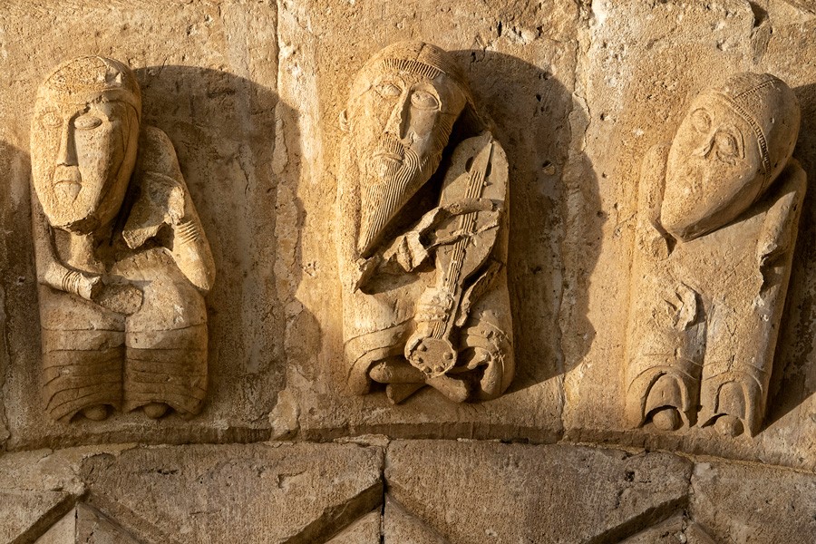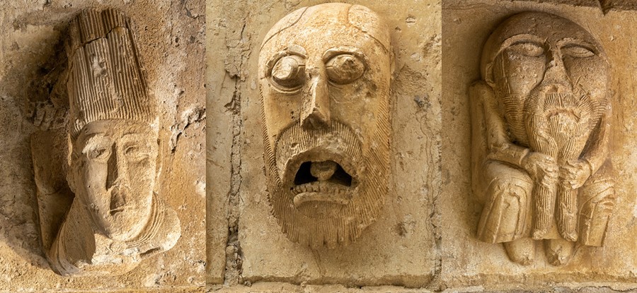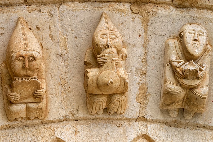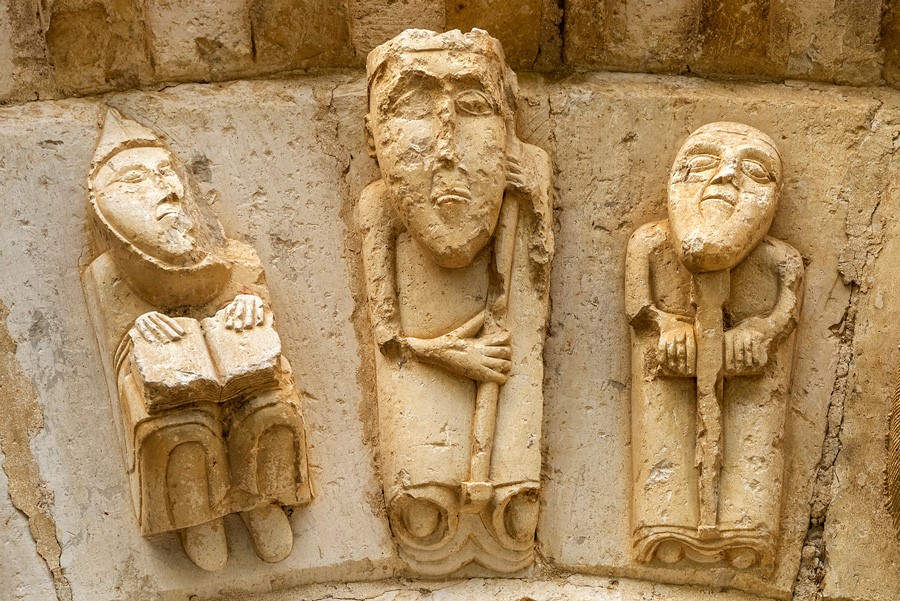 En la tercera arquivolta se descubren dieciocho altorrelieves que representan a una serie de personajes que comparten una singular característica: grandes cabezas en forma de gota. Aunque a primera vista la talla parece tosca, una mirada más atenta permite descubrir unos marcados rasgos que otorgan una expresiva personalidad a cada una de las figuras. Por su personal estilo y técnica, parece ser que salieron de las manos de un artista del que no se conocen más obras.