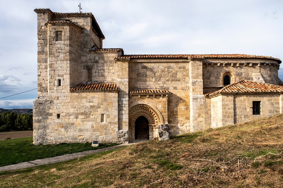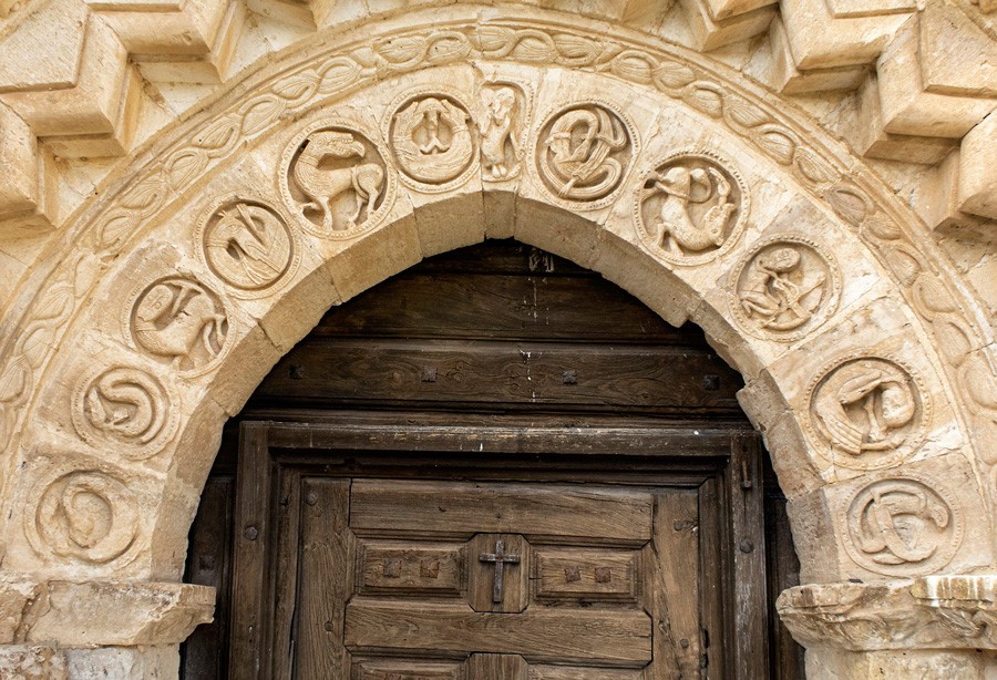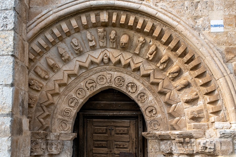 Sus cuatro arquivoltas apuntadas nos hablan de una fecha de construcción que estaría entre finales del siglo XII y comienzos del XIII. El conjunto está protegido por un tejaroz sostenido por canecillos. En la arquivolta que cumple la función de arco de ingreso aparecen esculpidos doce misteriosos medallones que se pueden identificar con los signos del zodiaco —los que mejor se reconocen son los signos de leo, virgo y sagitario—, pero también con los bestiarios fantásticos tan habituales en el románico. En las también burgalesas portadas de Soto de Bureba y Almendres se puede contemplar algo muy parecido.