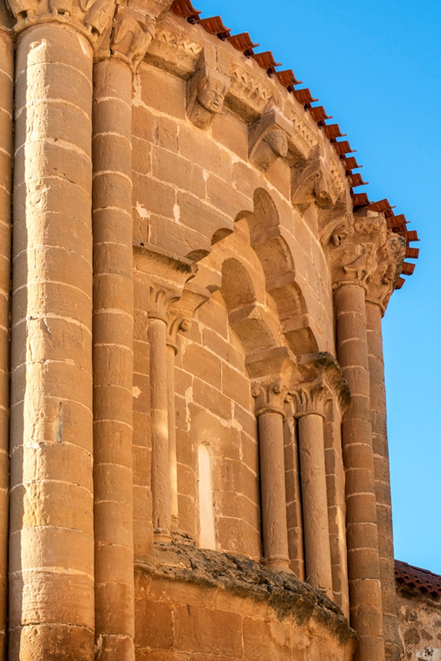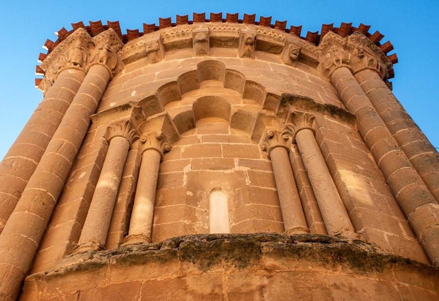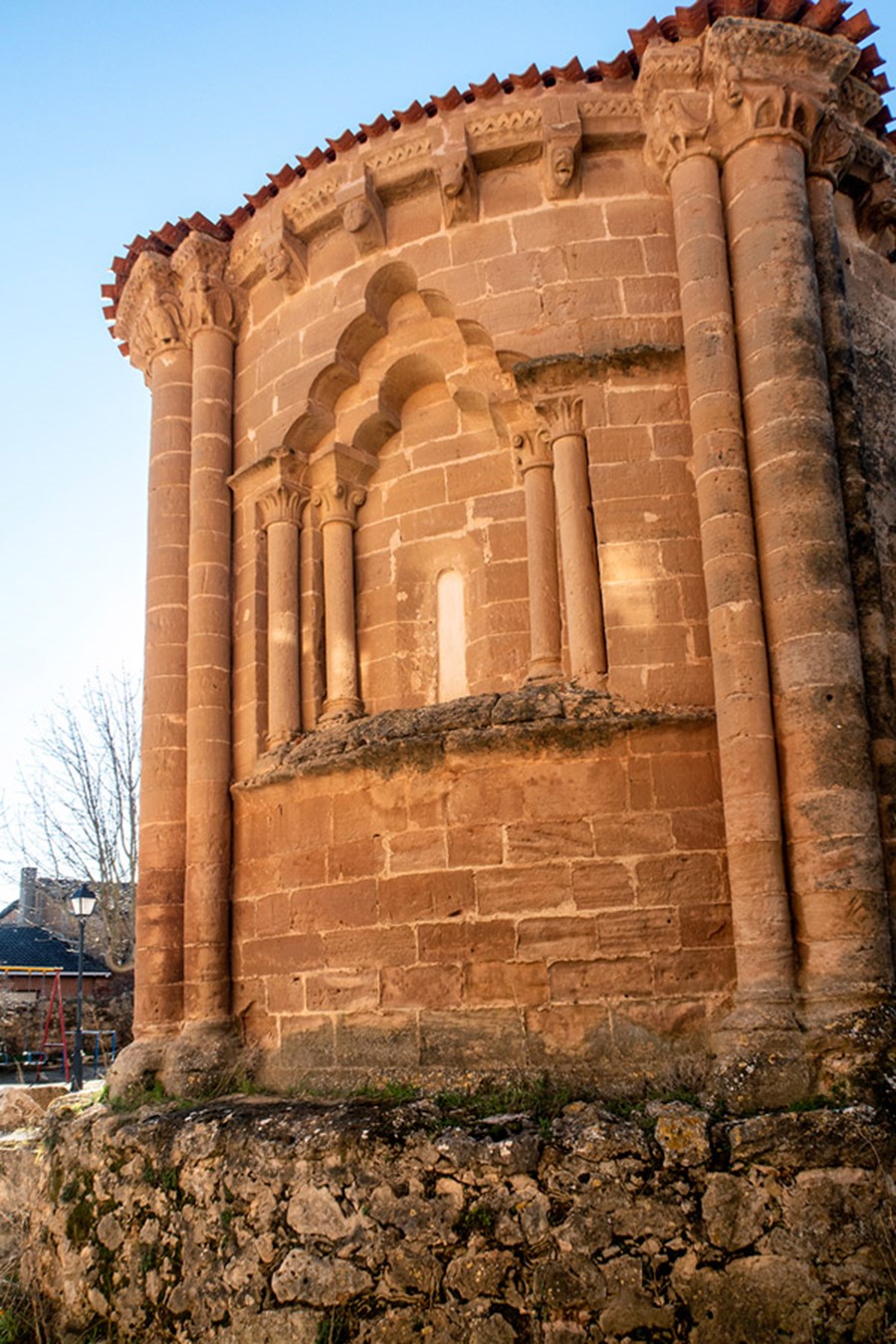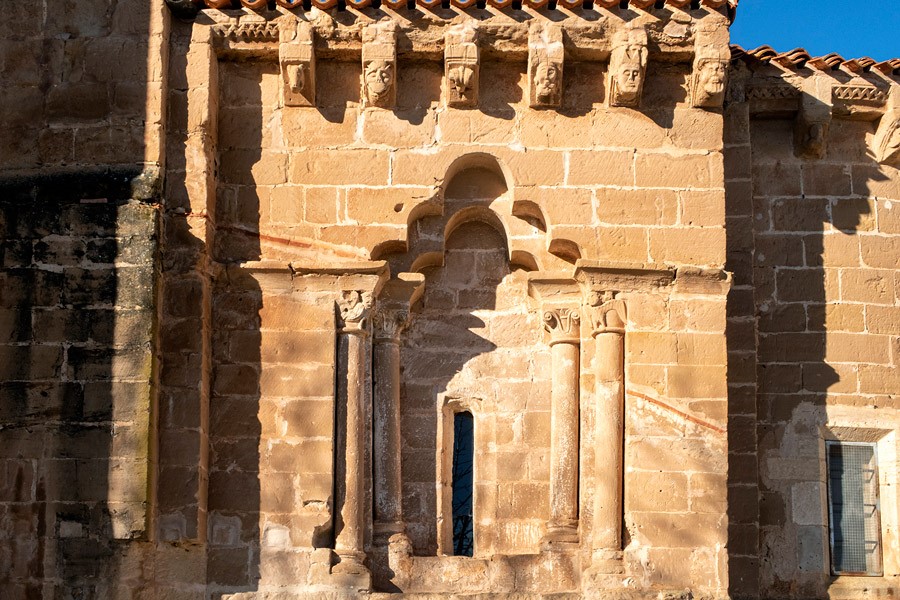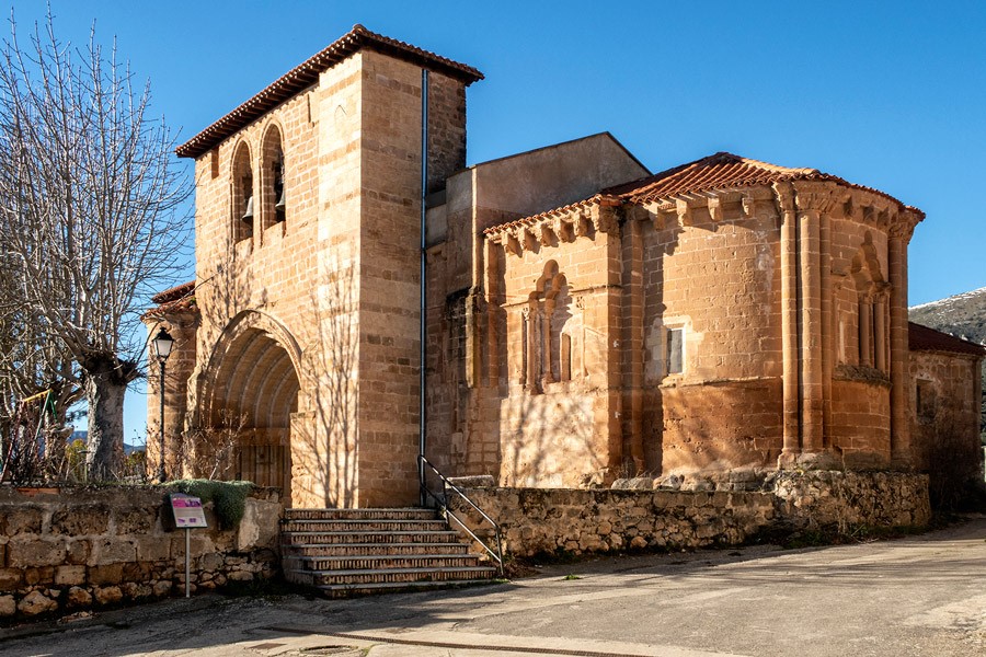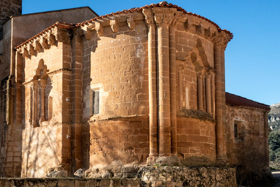 El elemento más llamativo de la iglesia, fechado a finales del siglo XII, es su ábside semicircular. Elevado sobre un zócalo, que salva el desnivel del terreno, muestra un elegante tambor absidal dividido en tres paños por dos haces triples de columnas. Siguiendo el modelo de la cercana iglesia de Soto de Bureba, la columna central de estos pilares presenta casi el doble de diámetro que las laterales. Mientras el haz de la izquierda está decorado por un cortejo de tres ángeles escoltados por aves con cabezas humanas; el de la derecha del espectador se remata por dos rugientes leones con aves-arpías a los lados.