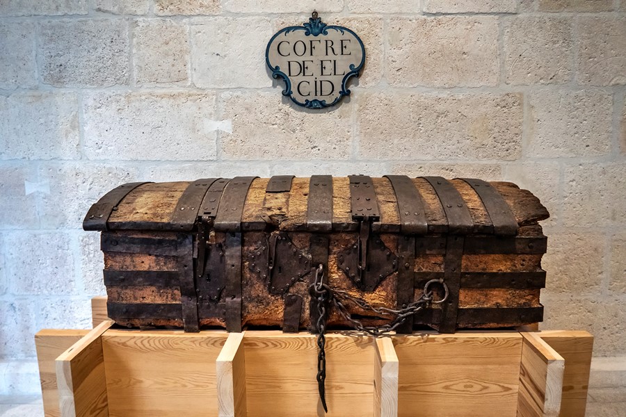 En un lugar señalado del claustro alto de la Catedral se expone el llamado Cofre del Cid, un arcón medieval que tradicionalmente se ha relacionado con el que aparece en la obra literaria del ‘Cantar de Mio Cid’. Mediante un ingenioso ardid Rodrigo Díaz de Vivar y Martín Antolínez —su vasallo más fiel— consiguieron que los prestamistas judíos Raquel y Vidas les entregaran, a cambio de dos arcas llenas de arena, 600 marcos, una mitad de oro y la otra de plata. En realidad, el cofre en cuestión es un arcón del siglo XIII-XIV en el que se guardaban bajo llave algunos de los más valiosos documentos del cabildo de la Catedral.