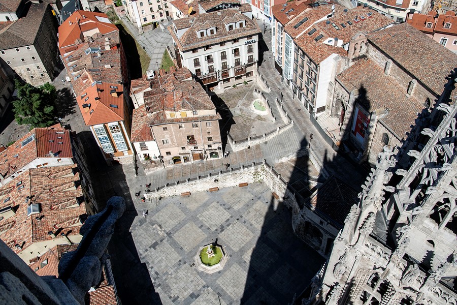 No existe mejor terapia contra el vértigo que asomarse a la plaza de Santa María desde los 80 metros de altura del remate de las torres de la Catedral. Si se consigue vencer el primer deseo de bajarse corriendo, las recompensas serán infinitas: unas increíbles panorámicas del templo y del casco antiguo de Burgos compartiendo el privilegio de los pájaros. Y no es un decir, ya que las zonas más elevadas del templo semejan una esculpida montaña de piedra caliza que desde siempre ha sido frecuentada por halcones, cernícalos, lechuzas, grajos y cigüeñas.