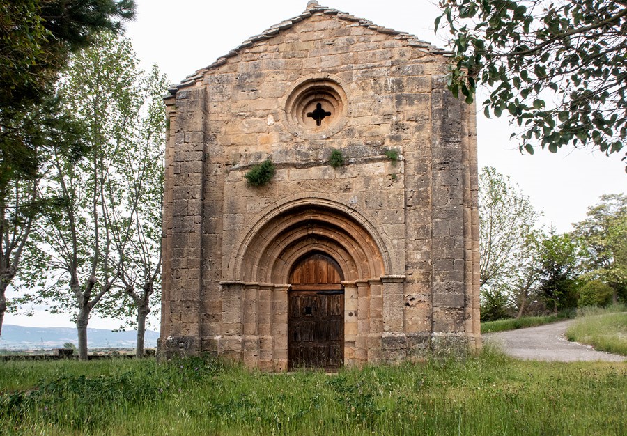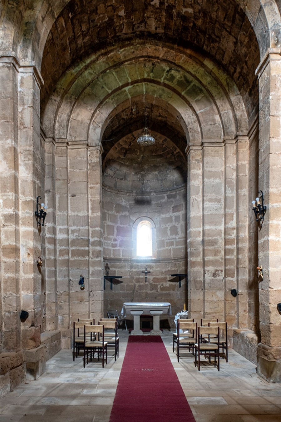 El interior del templo —se puede admirar desde un pequeño ventanillo practicado en una de las puertas de entrada— es intencionadamente oscuro ya que solo se ilumina por la escasa luz que penetra por la saetera del ábside y el óculo de la portada. Parece que los constructores quisieron crear un ambiente intimo y misterioso. En la penumbra se distingue la bóveda de medio cañón, reforzada por dobles arcos fajones que cubre los tres tramos en los que se divide la nave. Un estrecho arco triunfal, con cuatro roscas sobre robustos pilares, da paso a la cabecera. Mientras el primer tramo recto, que se corresponde con el presbiterio se cubre con bóveda de cañón, el ábside luce el clásico cascarón.