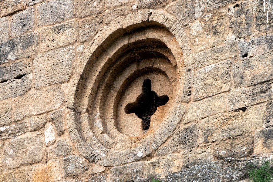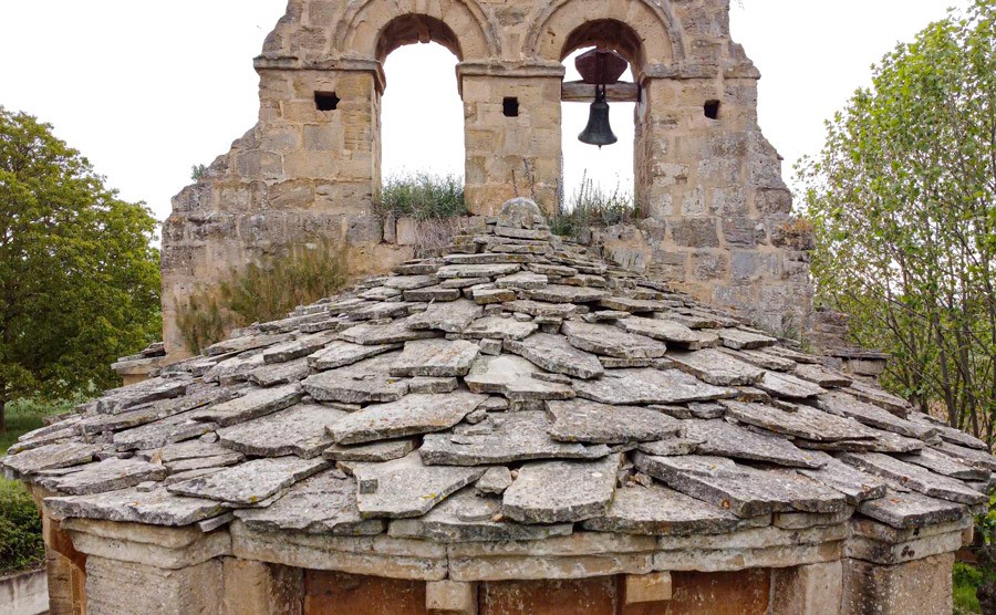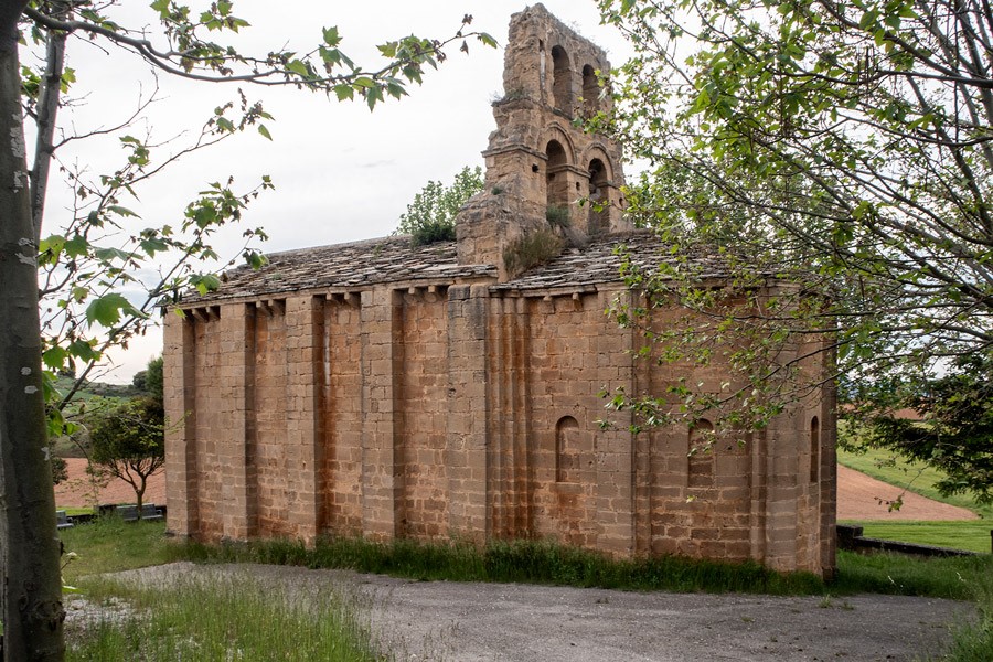 El conjunto de repetidos contrafuertes genera un buscado efecto óptico de verticalidad que hace parecer al templo bastante más alto de lo que es en realidad. Otro elemento arquitectónico que contribuye a ello es la esbelta espadaña de dos pisos escalonados que se alza sobre el arco triunfal, muy señalado al exterior, que separa la nave de la cabecera. El singular aspecto tectónico y pétreo de San Martín se ve incrementado por otra singularidad: la cubierta está formada, en vez de por las habituales tejas de barro cocido, por lastras de piedra sujetas con mortero.