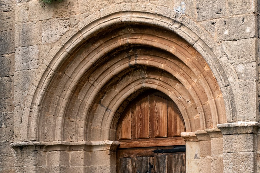 El hastial abierto hacia occidente es tan austero como todo el resto del edificio. Rematado a piñón en su parte inferior se abre una portada de arco apuntado con tres arquivoltas sobre jambas escalonadas. Un dato curioso es que las dovelas que dan forma a las arquivoltas están numeradas con las marcas de montaje: dos rayas la primera, tres la segunda y cuatro la última. En lo alto de la fachada se abre un óculo tetralobulado abocinado por cuatro roscas.