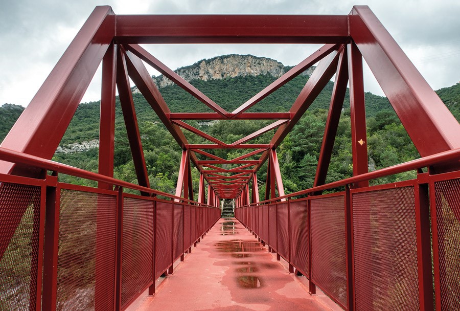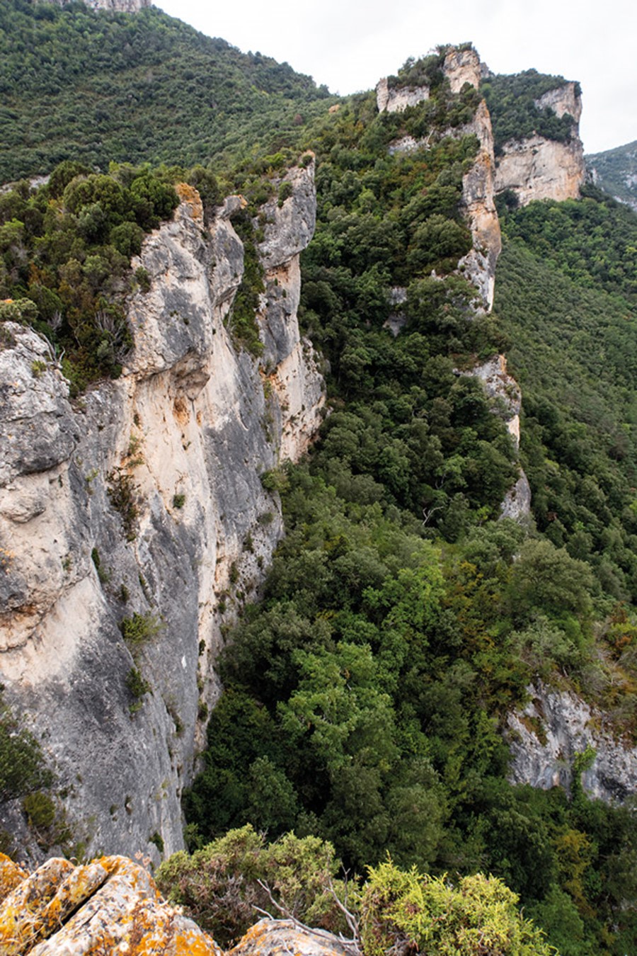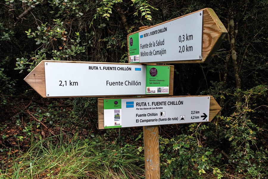 Para proseguir el recorrido hay que tomar el sendero que enfila hacia la espesa masa forestal que cubre buena parte de las empinadas y abruptas laderas septentrionales de las hoces. Enseguida se alcanza un canal abandonado y la correspondiente pasarela, desde donde hay que tomar el estrecho sendero que asciende zigzagueando por la densa selva que tapiza los empinados escarpes de los Riscos de Portilla. Para proseguir el recorrido hay que tomar la desviación que parte hacia la derecha, Ruta 1 Fuente Chillón, que está señalizado en todo momento y con dos franjas paralelas de color azul, pintadas por los responsables del Parque Natural de Montes Obarenes-San Zadornil.
