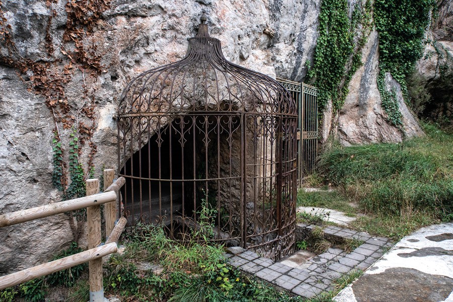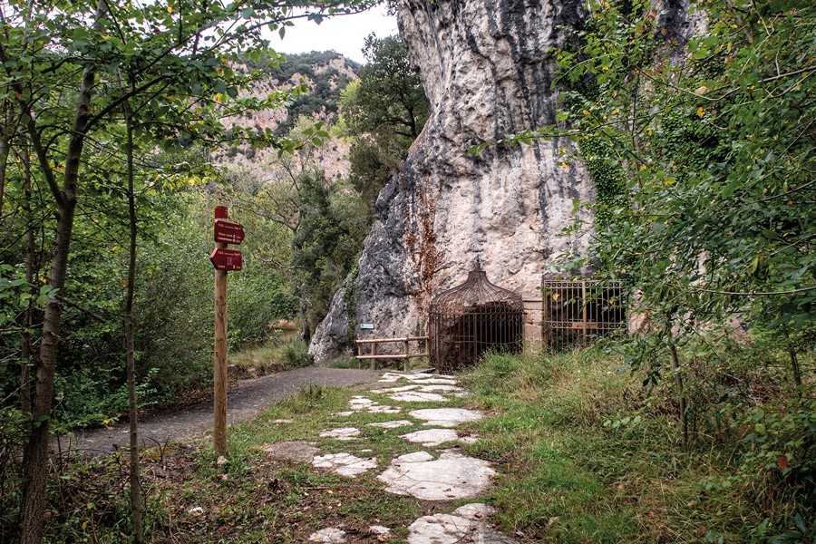 Antes de tomar el sendero que asciende a lo alto de los Ricos de Portilla, merece la pena seguir durante unos metros el señalizado camino que alcanza la Fuente de la Salud. Este manantial, que brota del interior de una cueva protegida por una artística reja modernista, formaba parte de las instalaciones del balneario de Sobrón. Sus excelentes aguas bicarbonatadas y sódicas dieron fama internacional a unas instalaciones compartidas por la citada localidad vasca y la burgalesa de Villanueva de Soportilla.