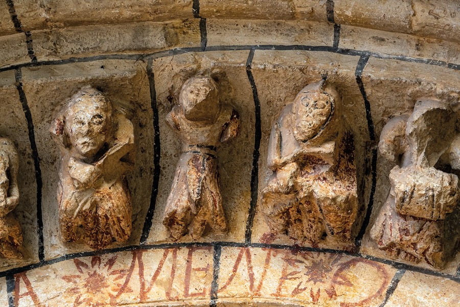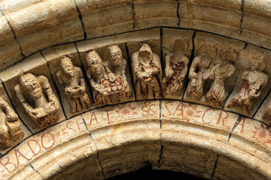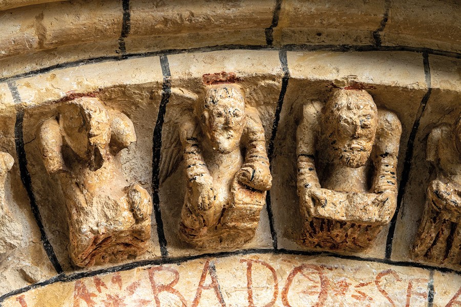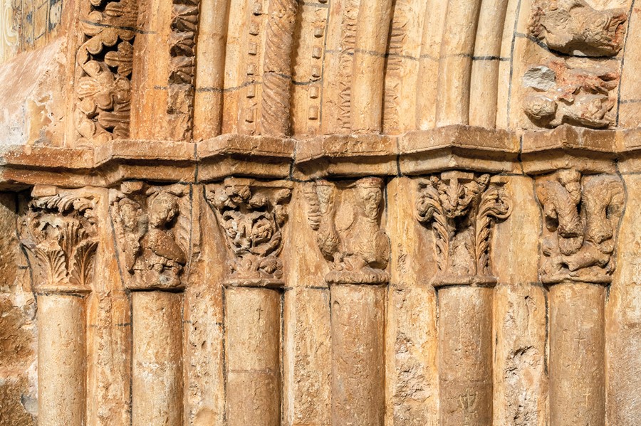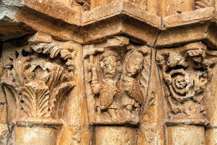 En los capiteles se pueden ver, entre otras escenas, arpías enfrentadas, guerreros luchando, un jinete matando a un monstruo con alas y dos cuadrúpedos devorando a un cordero.