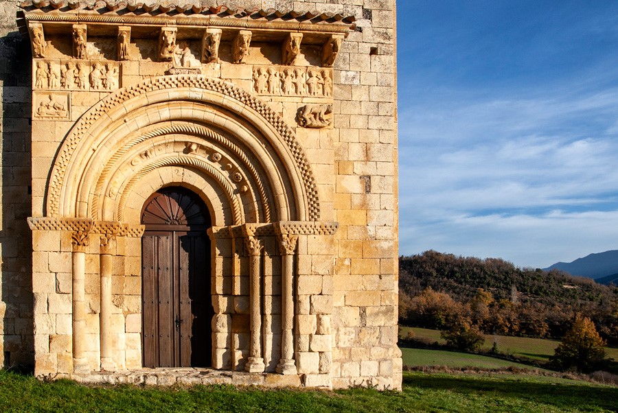 Bajo el hastial y protegida por un tejaroz —sostenido por ocho curiosos modillones que representan a los Evangelistas alados y a los animales del Tetramorfos— se abre la entrada del templo. Consta de una puerta estrecha y alargada, enmarcada por cuatro finas columnas y por una serie de arquivoltas de medio punto, decoradas con billetes, sogueados, bolas y rosetones.