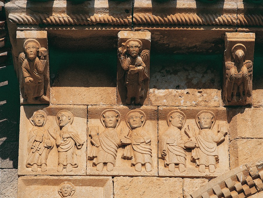 La iconografía de la portada se completa con varios relieves que destacan por su sencillez y elegancia: los dos frisos de los Apóstoles acompañando la Ascensión, la escena central de la Ultima Cena y una más enérgica y vibrante representación de la lucha entre un león y un hombre. También los canecillos que sustentan las cornisas del ábside y las fachadas poseen un variado repertorio iconográfico, en el que sobresalen los temas lúdicos y eróticos.