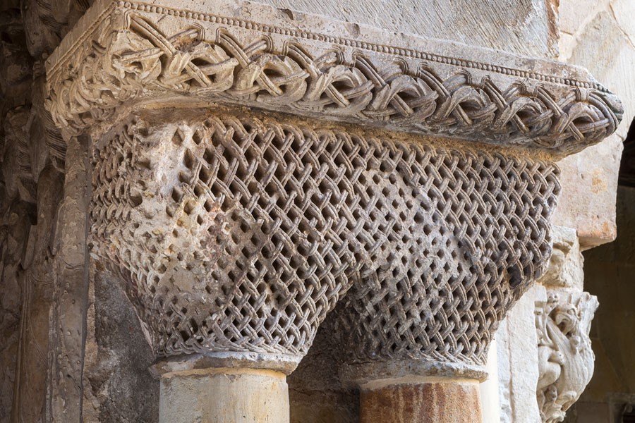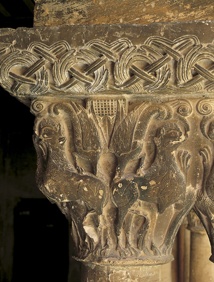 También es única la originalidad de la mayoría de los motivos que aparecen esculpidos en los capiteles y en los pilares angulares —ornados con ocho grandes relieves sobre la vida de Cristo y la Virgen— que separan las cuatro galerías. Las fuentes iconográficas en las que se inspiraron los diferentes artistas, sobre todo los conocidos como primer y segundo maestros, pueden rastrearse tanto en los elementos decorativos de las telas y marfiles que llegaban de Oriente, como en los manuscritos miniados mozárabes que se estaban copiando en el scriptorium del propio monasterio. Los 64 capiteles repartidos entre las crujías del piso inferior, en los que se ha rastreado la huella de cuatro escultores, mantienen entre ellos una forma y unas medidas semejantes. Todos son de una pieza, descansan sobre columnas dobles de fustes separados y sostienen arcos de perfecto medio punto. El repertorio iconográfico de los capiteles se recrea y alcanza una perfección nunca igualada en la serie de representaciones de distintos animales fantásticos.