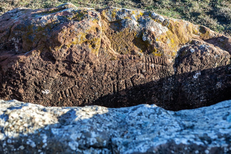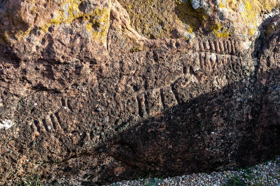 El pasillo, que consta de dieciséis grandes elementos pétreos, tiene más de diez metros de largo y un metro y medio de ancho. En una de las losas que forman el corredor se descubrieron una serie de grabados rupestres que representan, de manera esquemática, las figuras de dos cuadrúpedos resueltos por un trazo horizontal del que surgen una serie de apéndices para dar forma a las orejas, el cuerpo y las patas de los animales. Junto a los équidos se puede contemplar un ramiforme horizontal que se ha querido interpretar como un símbolo solar. Estos tres grabados, que tienen la misma asignación cronológica que el dolmen, constituyen una de las pocas representaciones del arte postpaleolítico localizadas fuera del interior de una cueva.