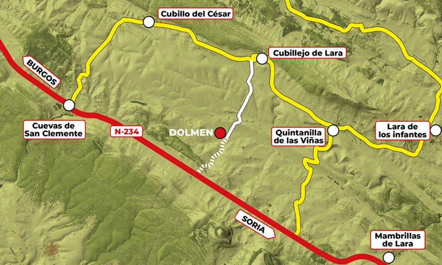 Una vez en la carretera de Soria, N-234, hay que proseguir hasta la localidad de Cuevas de San Clemente. Desde allí es necesario desviarse con dirección a Cubillo del César y Cubillejo de Lara. Poco antes de llegar a este último pueblo se descubre la señalizada pista de tierra que, por la derecha y tras dos kilómetros y medio, alcanza el sepulcro megalítico. Para contemplar el fenómeno hay que estar en el dolmen de Cubillejo/Mazariegos a la 8:30 h. El sentido común nos dice que tendremos que llevar una buena ropa de abrigo y elegir un amanecer despejado.