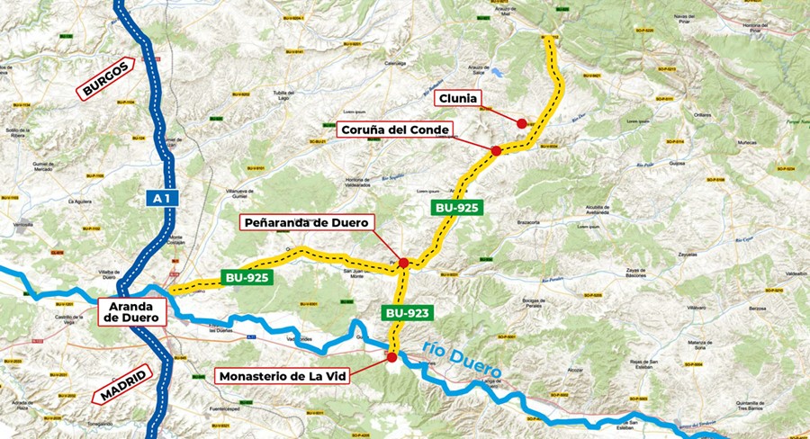 La ciudad romana de Clunia, lugar en el que se inicia este recorrido por el norte de la Ribera del Duero burgalesa, dista unos 100 kilómetros de la capital provincial. El mejor acceso a la zona se realiza a través de la A-1 y la localidad de Aranda de Duero. Desde allí las carreteras locales BU-925 y BU-923 permiten enlazar con Clunia, Peñaranda de Duero y La Vid.
