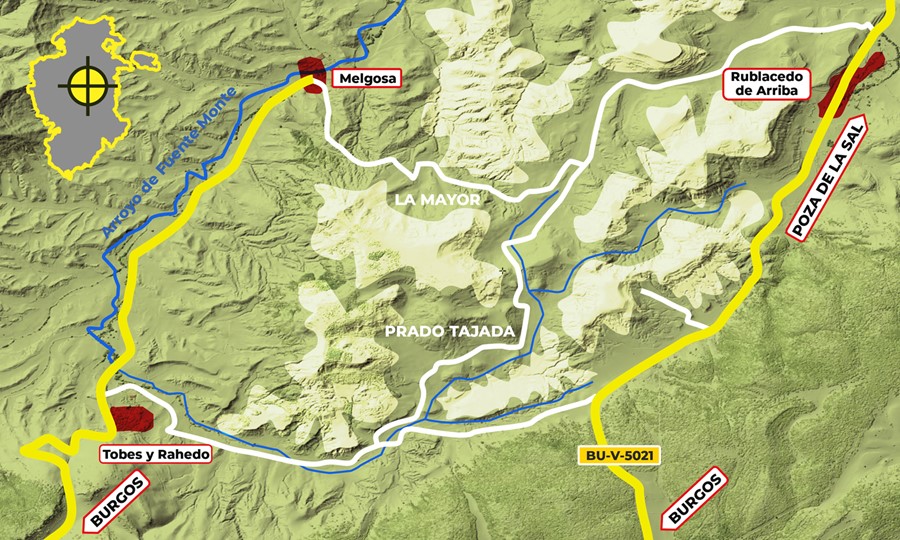 Para visitar una de las zonas más espectaculares del Valle de las Navas, la cabecera del arroyo de Fuente Monte, hay que alcanzar primero Tobes y Rahedo. Desde esta localidad parte una pista de concentración que recorre un vallejo presidido por los cerros de Prado Tajada y La Mayor. Otros rincones interesantes se localizan cerca de Melgosa, Arconada, Quintanarruz, Valdearnedo y Abajas.