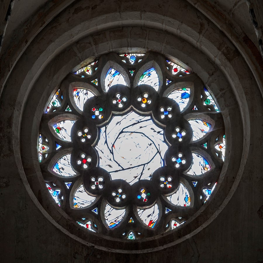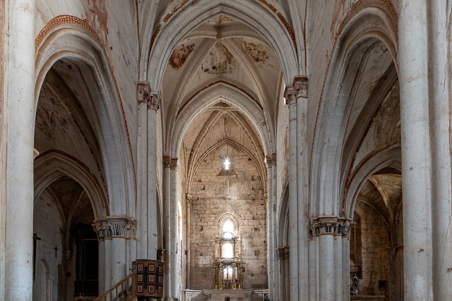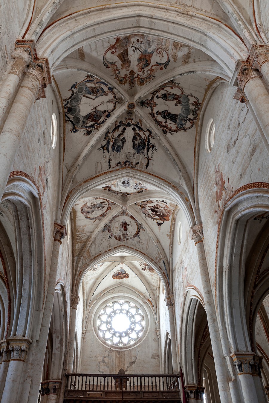 El interior se ilumina principalmente por un gran rosetón polilobulado de 4,5 metros de diámetro, practicado en el hastial occidental y que conserva algunos restos de la original vidriera gótica. Debajo del rosetón se puede admirar un coro de madera del siglo XVI.